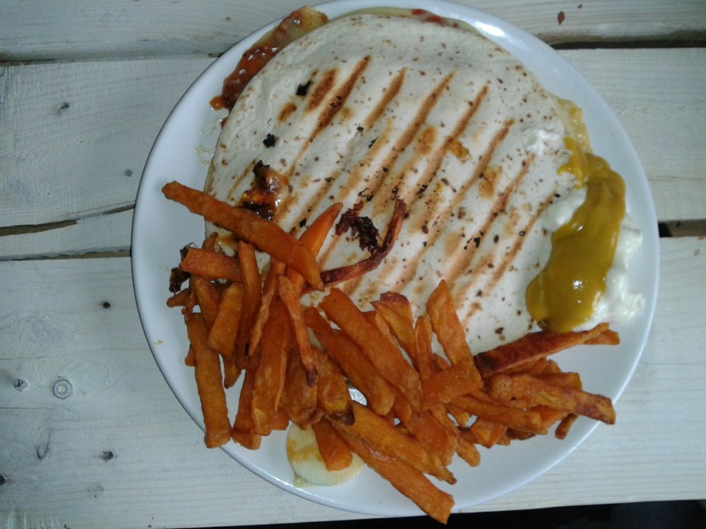 Þetta brasaði ég í kvöld. Tortillur með osti, villisveppaosti, HoneyPecanBBQ sósu (fæst í Kosti), tvö harðsoðin egg, , steiktur laukur, hálfur tómatur og hvítlaukspipar, smellt í Foreman-inn í 6 mín. Serverað með sætum kartöflum (bökuðum í ofni) og léttmajó með dass af hunangsDijon sinnepi. Díliss!