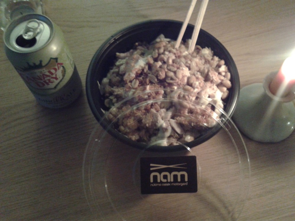 Hrísgrjón með kjúklingi frá Nam í Ártúnsbrekkunni. Ótrúlega góður matur, skil ekki af hverju þeir opna ekki stað nær siðmenningunni. Svolítið flókið að panta matinn hjá þeim, þ.e.a.s. maður velur allt í réttinn sinn sjálfur. Ég fékk mér hrísgrjón með kjúklingasúpu, bauna-grænmeti, kjúklingur, kryddhrísgrjón, wasabi-majónes, bangbang-sósa, ristaður hvítlaukur og hnetur. Skolað niður með Diet Canada Dry Ginger Ale (fæst í Kosti, frábær drykkur (sérstaklega í áfenga drykki)).