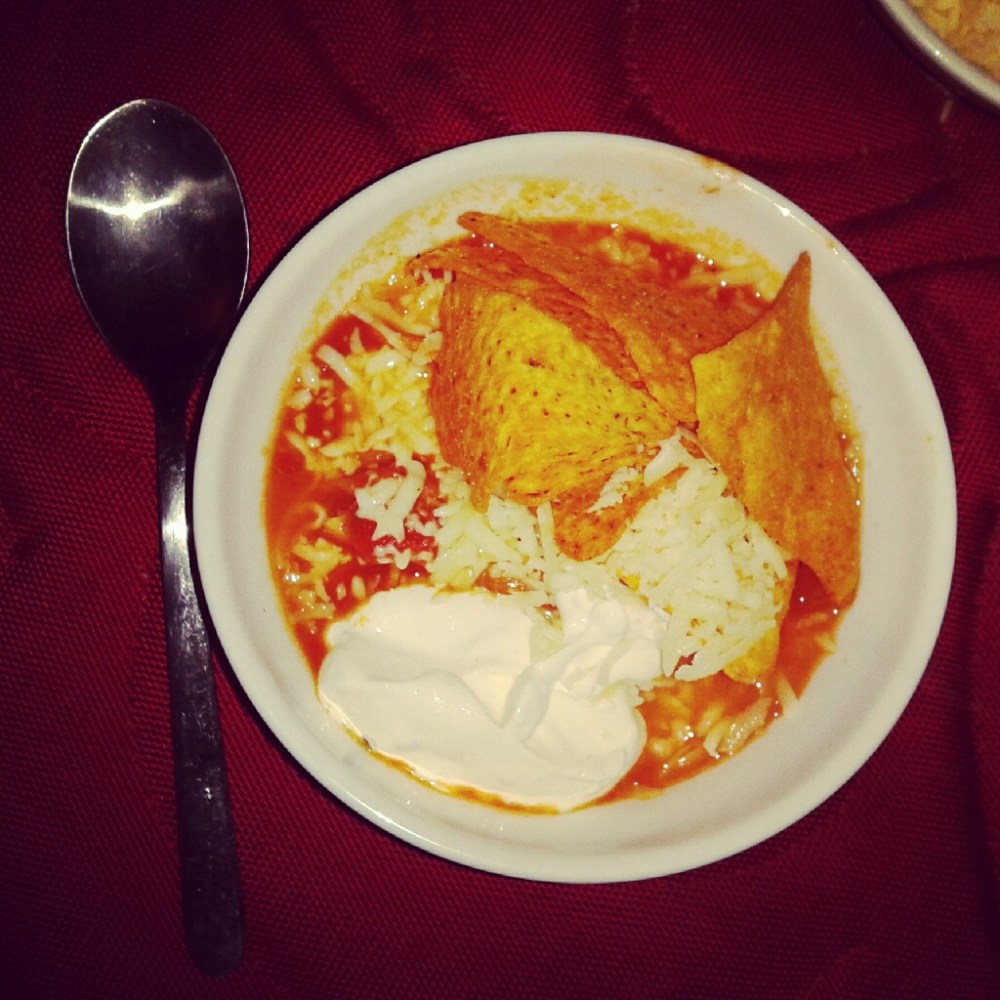 Malla vel saman, setja kjúklinginn útí síðustu 10 mínúturnar. Servera með Doritos, sýrður rjóma og osti. Drekka bjór með. Mmmmm.