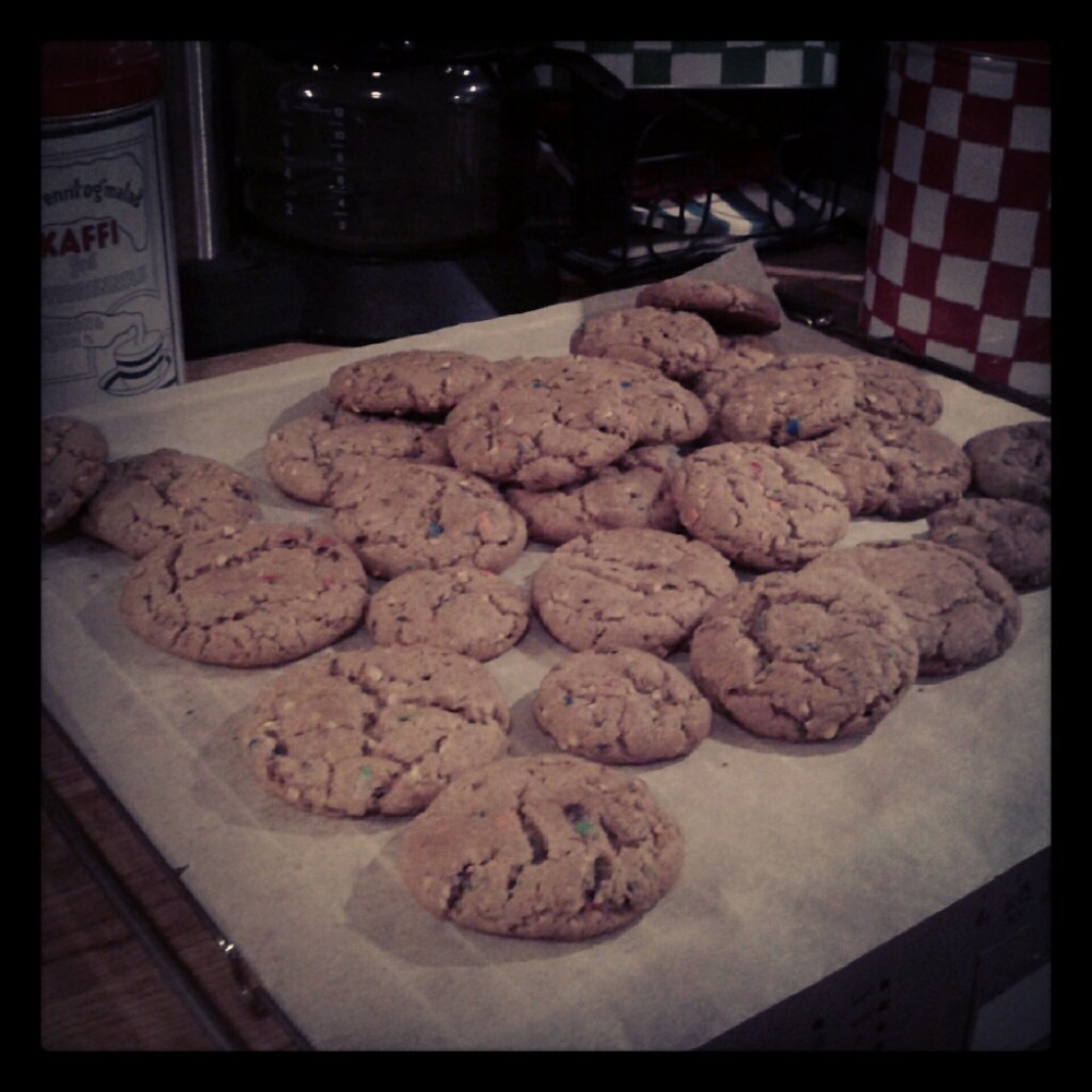 Tók nýtt twist á M&M kökunum sem ég hef áður fjallað um. Muldi M&M-ið og bætti 80gr af brytjuðu rjómasúkkulaði útí. Skipti líka út sykrinum fyrir hrásykur. Svei mér þá við erum að nálgast fullkomnun:
