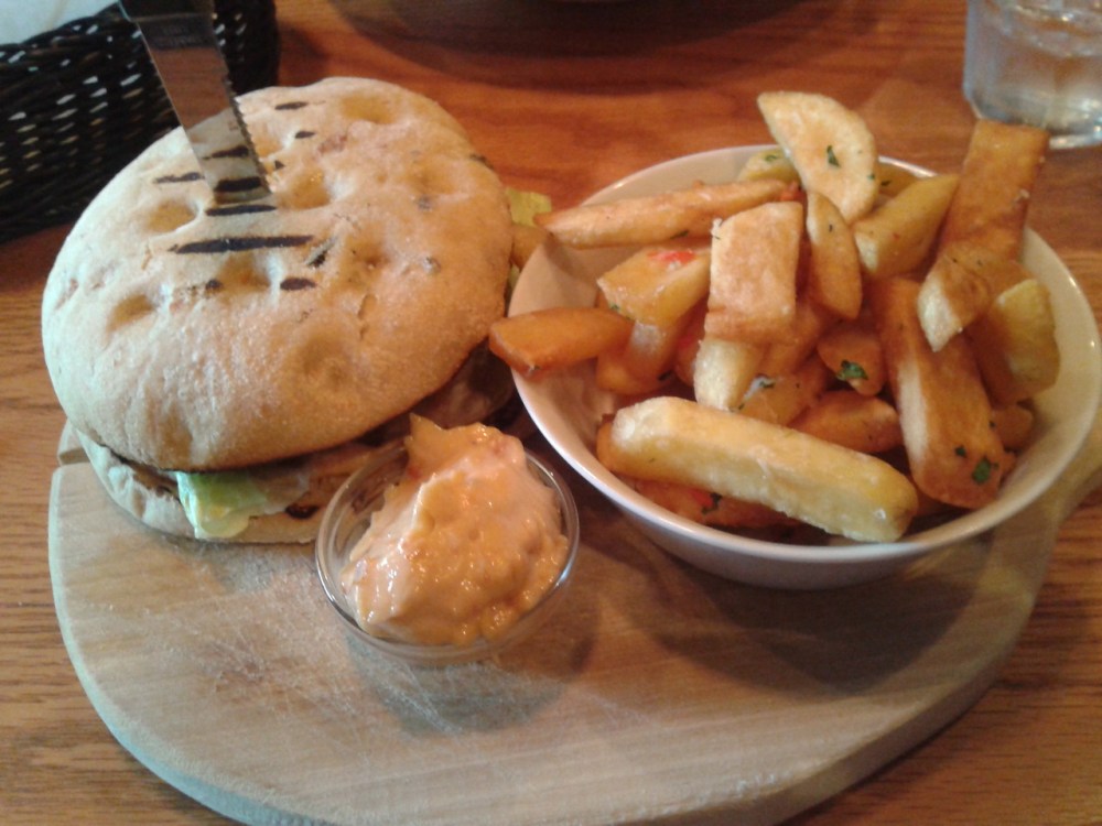 „Rustic“ 140g Italian hamburger with cheese, tomato aioli, Prosciutto di Parma, romaine lettuce, mushrooms, red onion, chili and home-made ketchup. Served with chili-parmesan fries and tomato aioli.