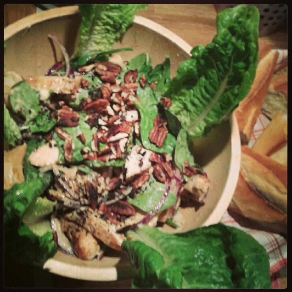 BBQ-kjúklingasalat með vínberjum og ristuðum pekan-hnetum.
