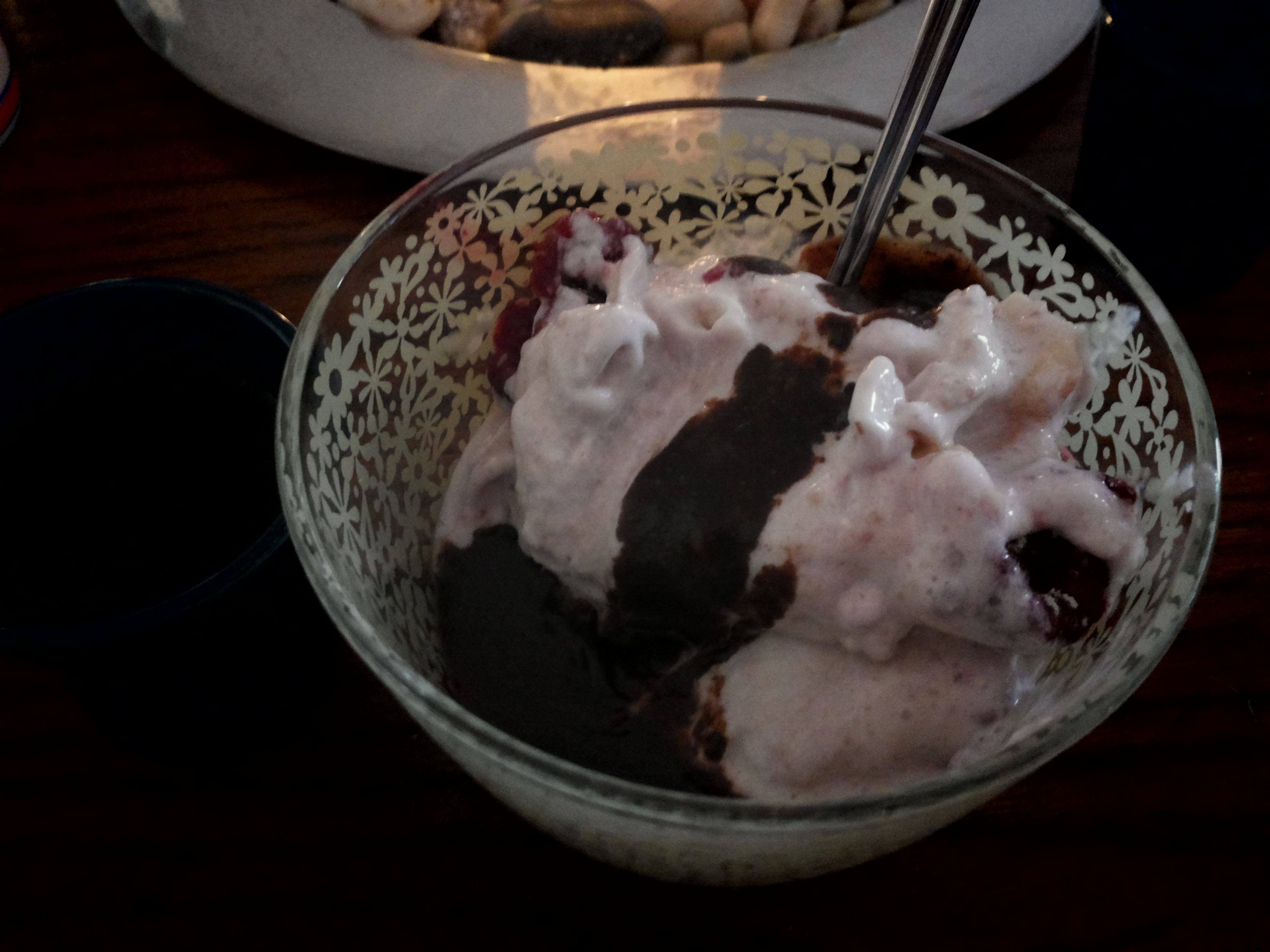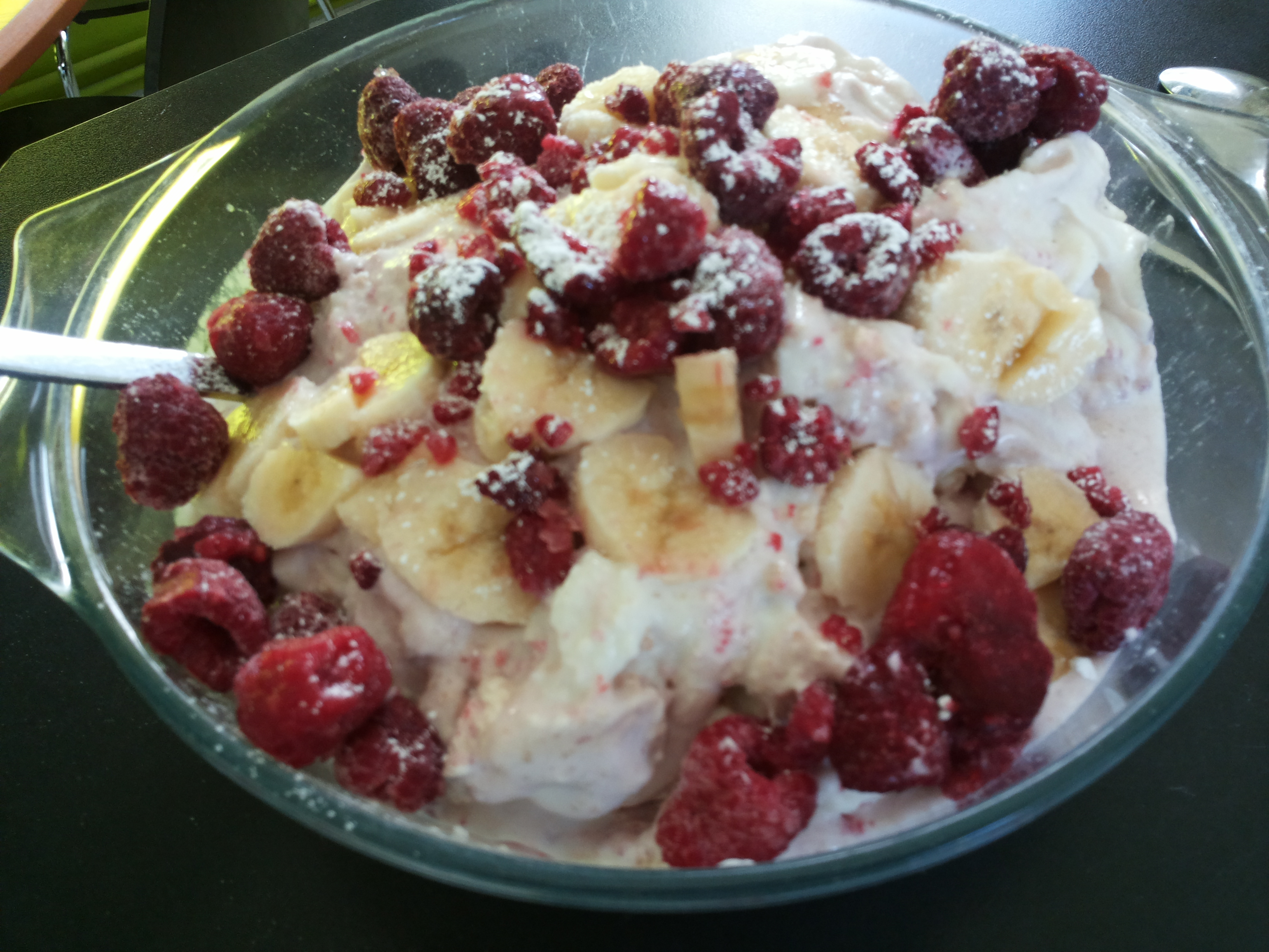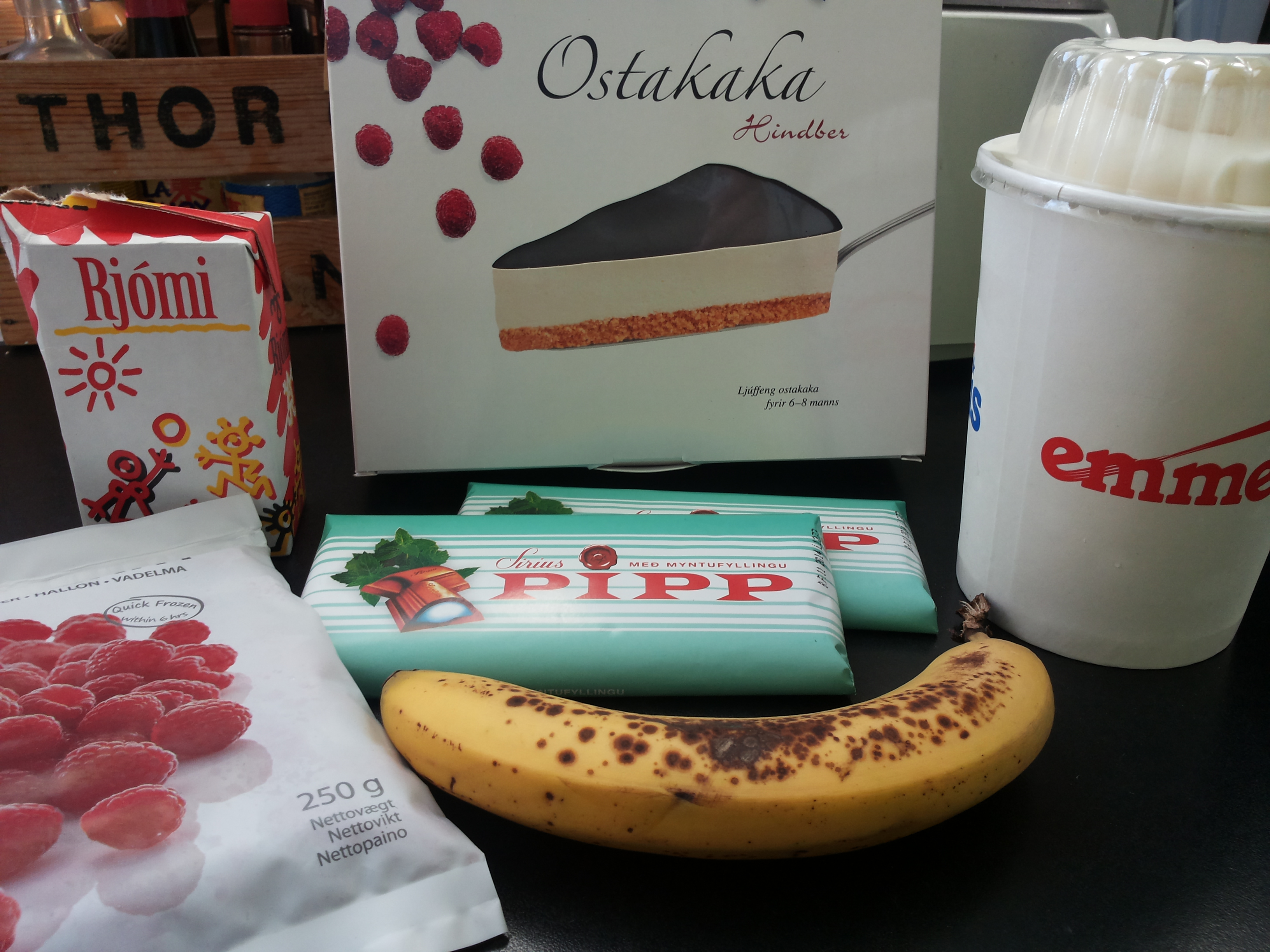 Súkkulaðið og rjóminn er sett í pott og látið sjóða saman í sósu. Ostakökunni og ísnum er dömpað í skál og öllu jukkinu hrært gróft saman. Sett í huggulega skál, bananar og hindber á toppinn og sigtaður flórsykur yfir. Ísinn og ostakakan tala saman og bananinn gerir gott mót, piparmyntubragðið slefar svo yfir allt jukkið. Gúrmei stöff. Serverist með rótsterkum rudda…kaffi that is.