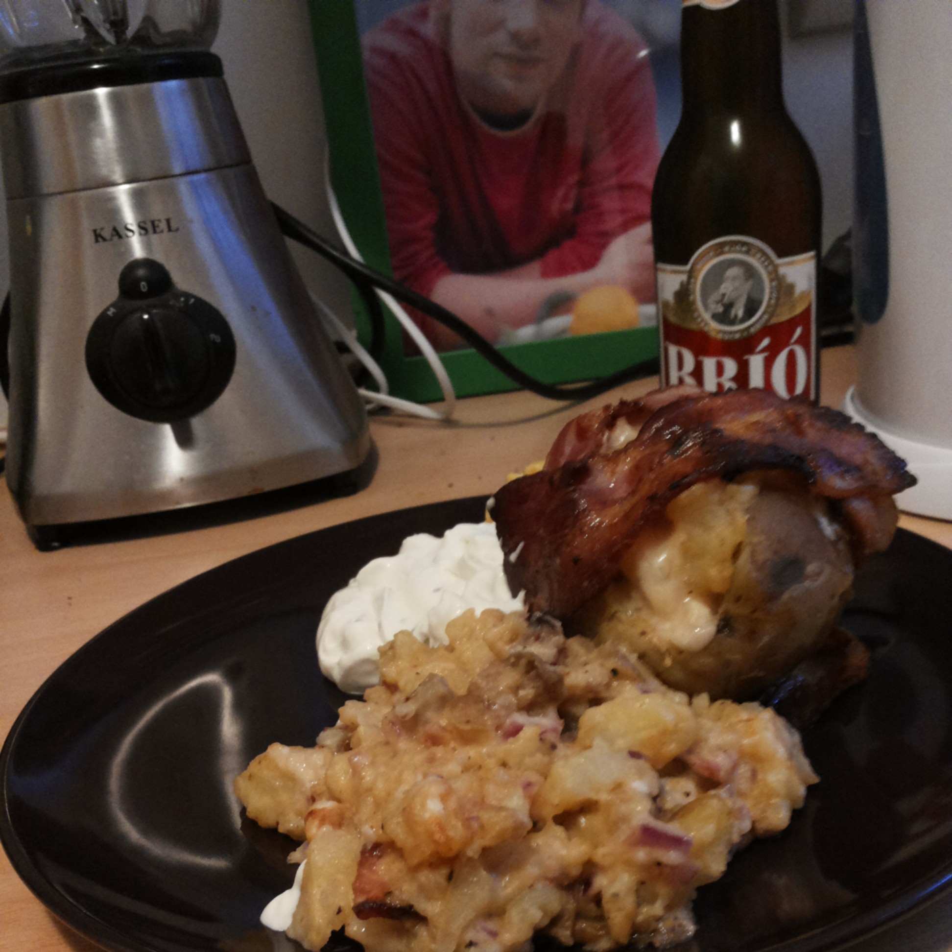 Maður byrjar á því að baka kartöflurnar í ca 60-90 mínútur eða þar til þær eru gegnbakaðar. Hluti af baconinu er smurður með BBQ-sósunni og steikt þar til vel crispy.
