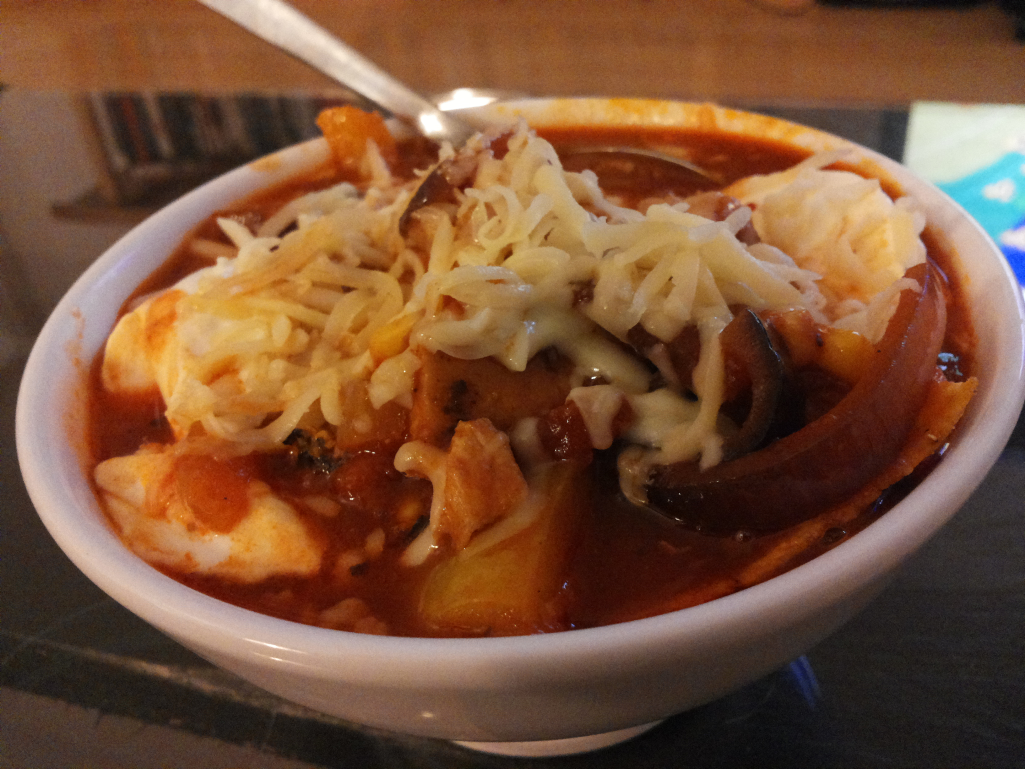 Rauðlaukurinn og hvítlaukurinn er steiktur í olíu þar til hann byrjar að brúnast, þá er restinni af grænmetinu dembt útí og síðan tómatjukkinu.