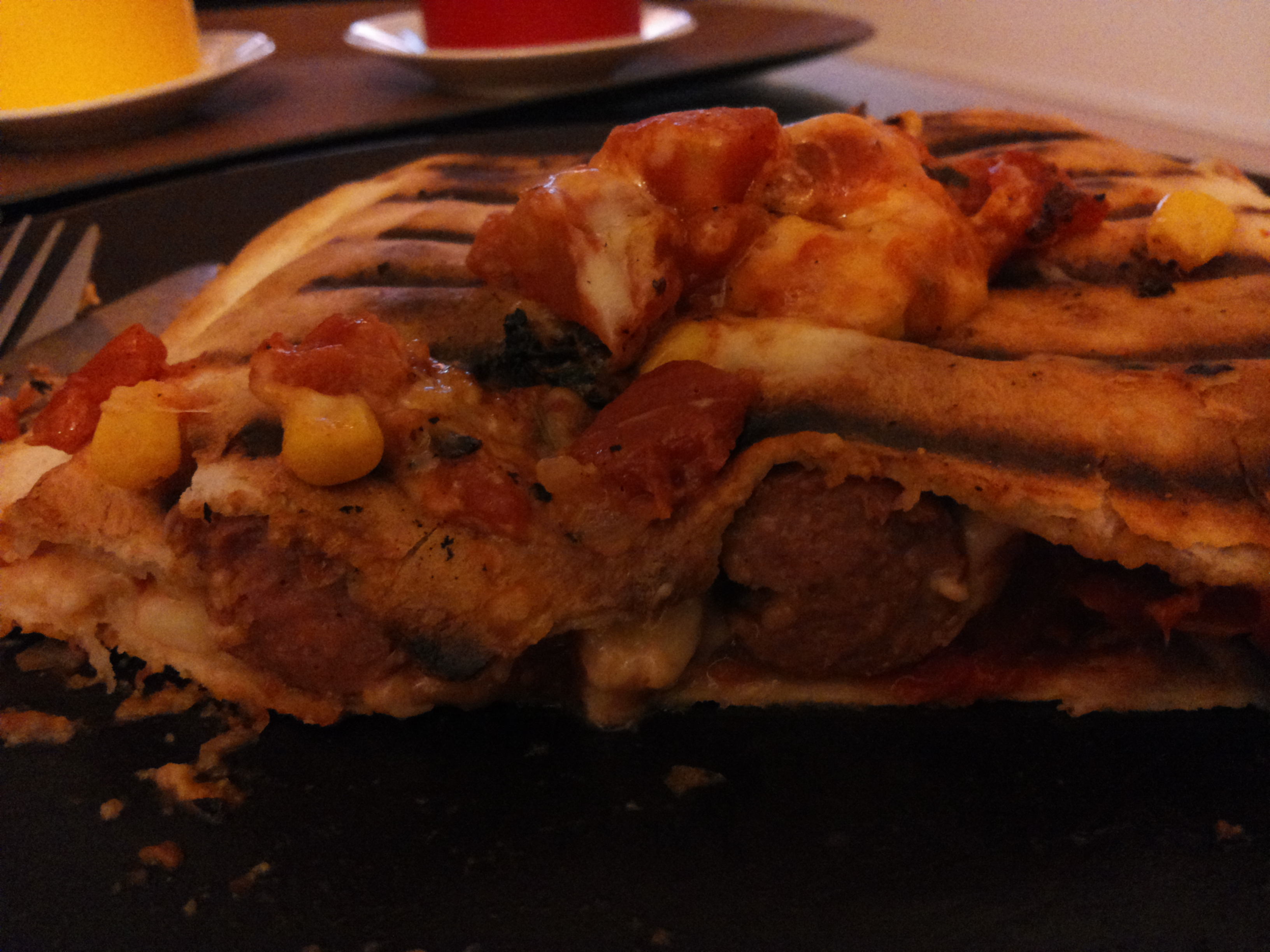 Tortillan er coveruð með osti, pylsur þar ofan á, salsa ofan á það, maísbaunir, meiri ostur, önnur tortilla þar ofan á, pakkað inn og sett í Foreman grill í 10 mínútur.