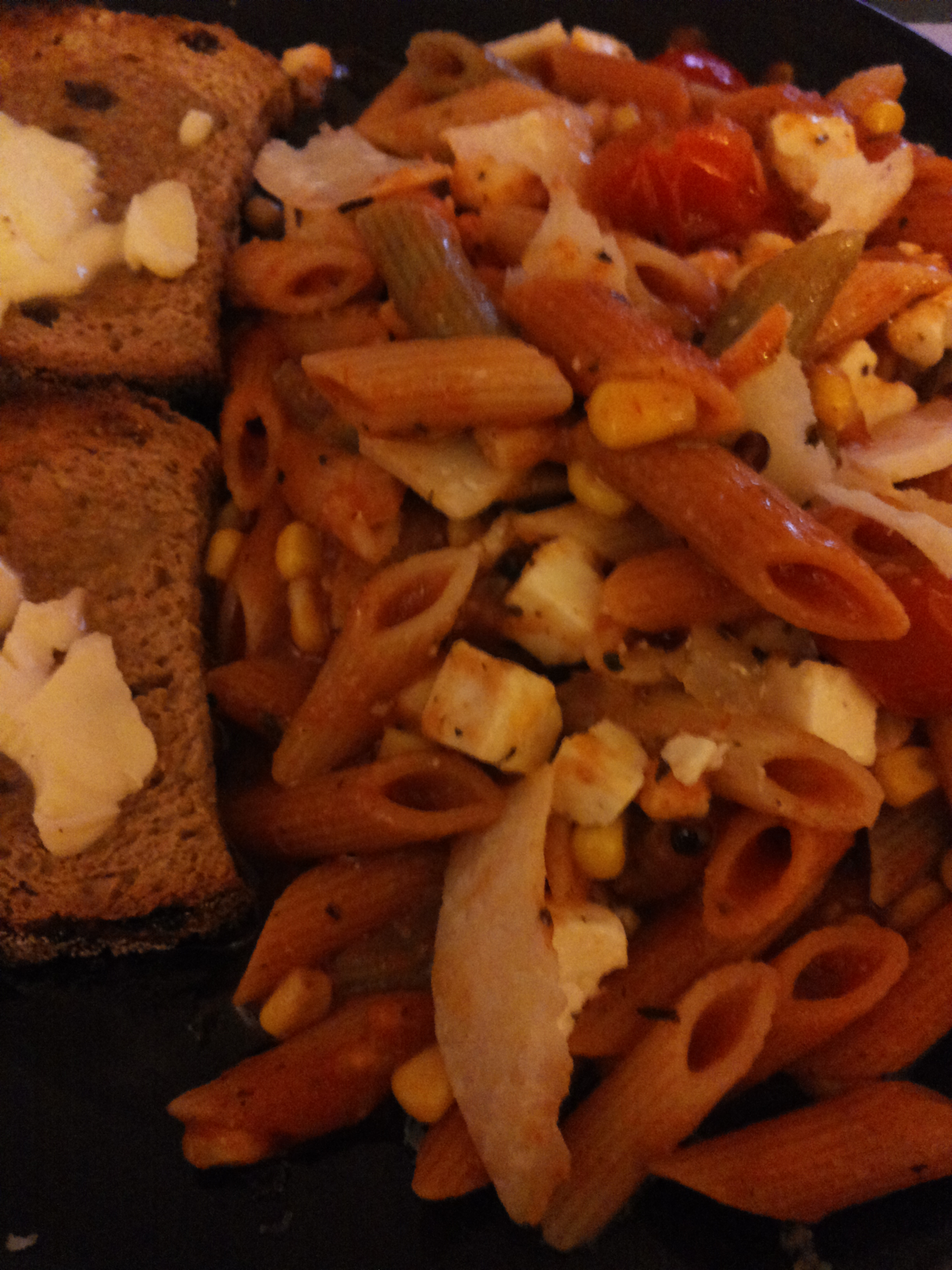 Ég varð að fá eitthvað létt og gott og gramsaði í skápunum, niðurstaðan varð pasta með tómat-pastasósu, kirsuberjatómötum, hvítlauk, maísbaunum, feta og parmesan.