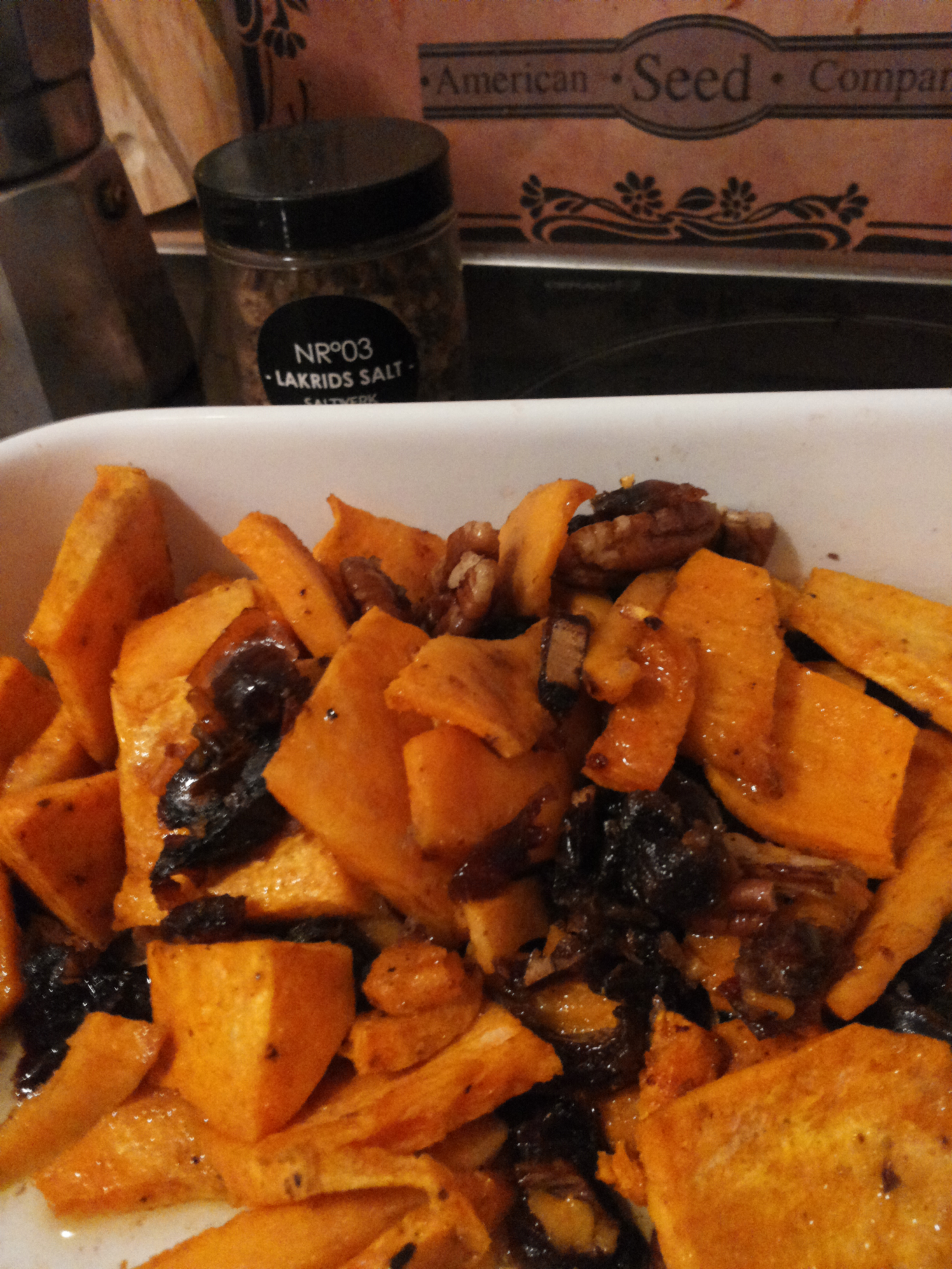 Ég er rosa hrifinn af sætum kartöflum. Þetta finnst mér topp stöff, þetta eru sætar kartöflur bakaðar í olíu með pecan-hnetum, döðlum, lakkrís salti frá Saltverki og anís kryddi.