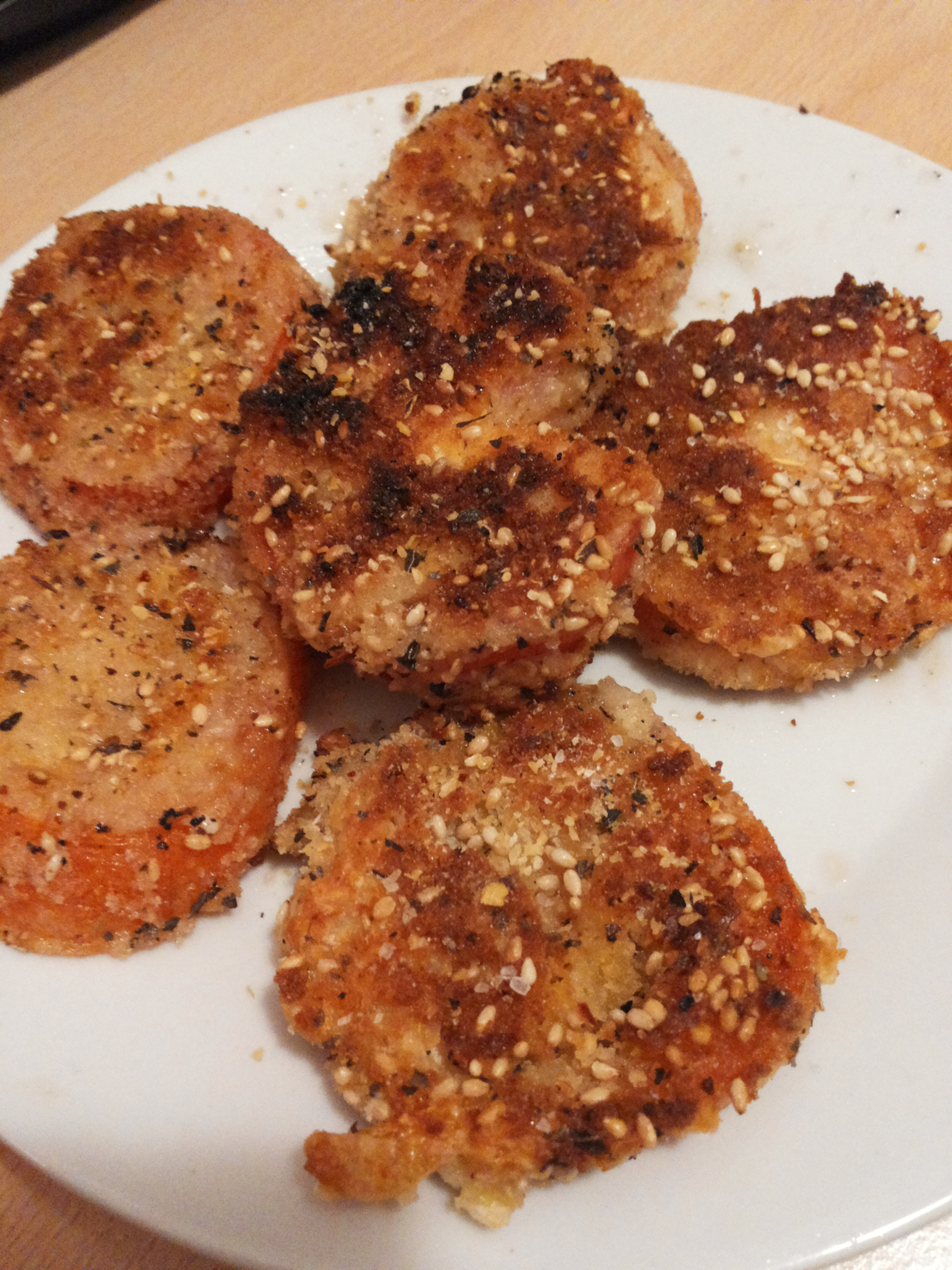 Tómötunum er velt upp úr hrærðu eggi og síðan í hveiti með hvítlauksdufti, þá aftur í eggið og svo í raspinn sem búið er að mixa með salti, pipar og basil. Þessu er síðan skellt á grillpönnu með smá olíu og sesam sáldrað yfir.
