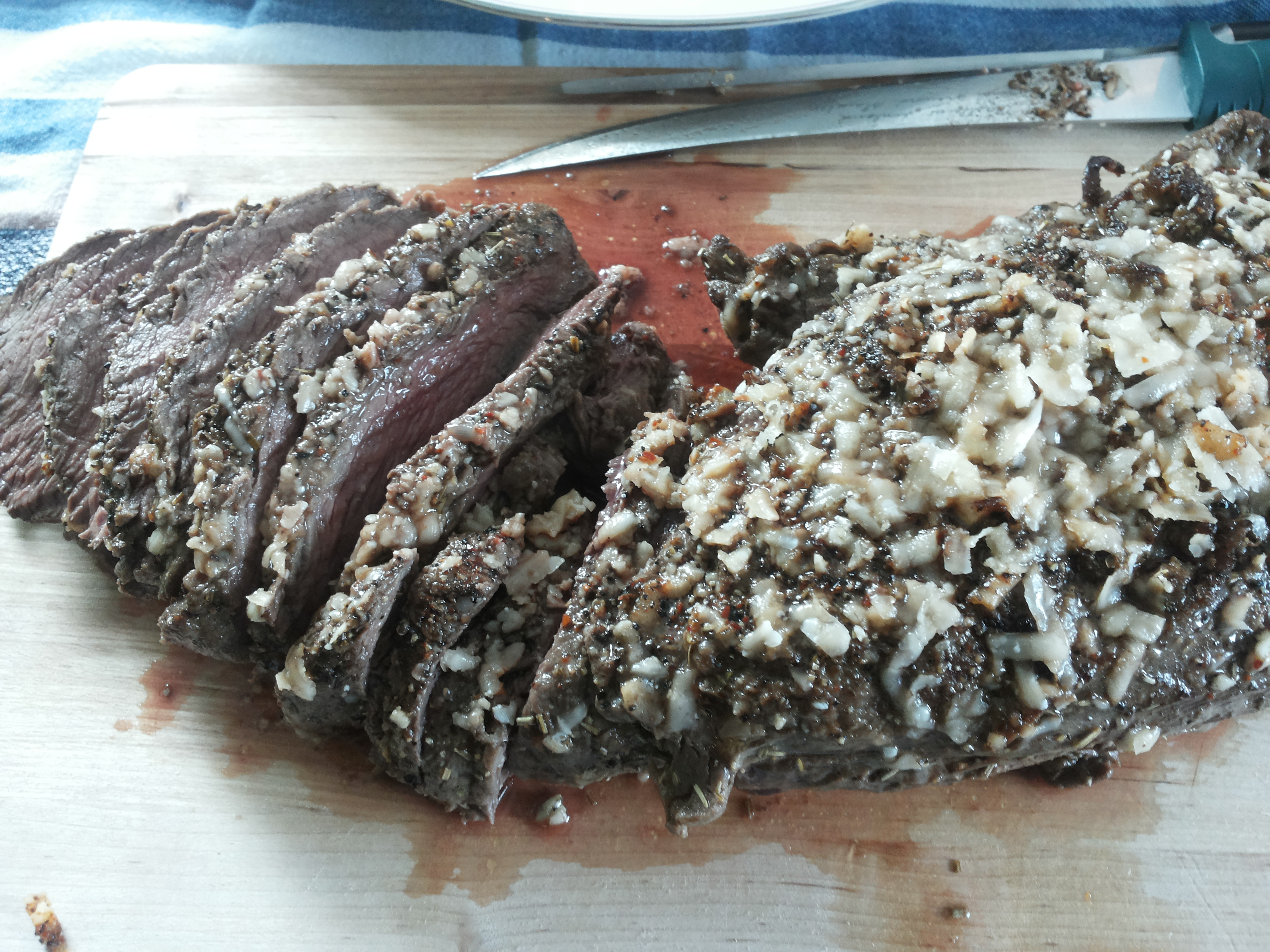 Svo er þetta bakað við 180°c þar til kjarnhiti er kominn í ca 58°c, þá er það látið standa í ca 20 mínútur áður en það er sneitt og sett á disk, þá er ágætt að salta ef þarf og bæta við pipar og parmesan (fæ ekki nóg af því).