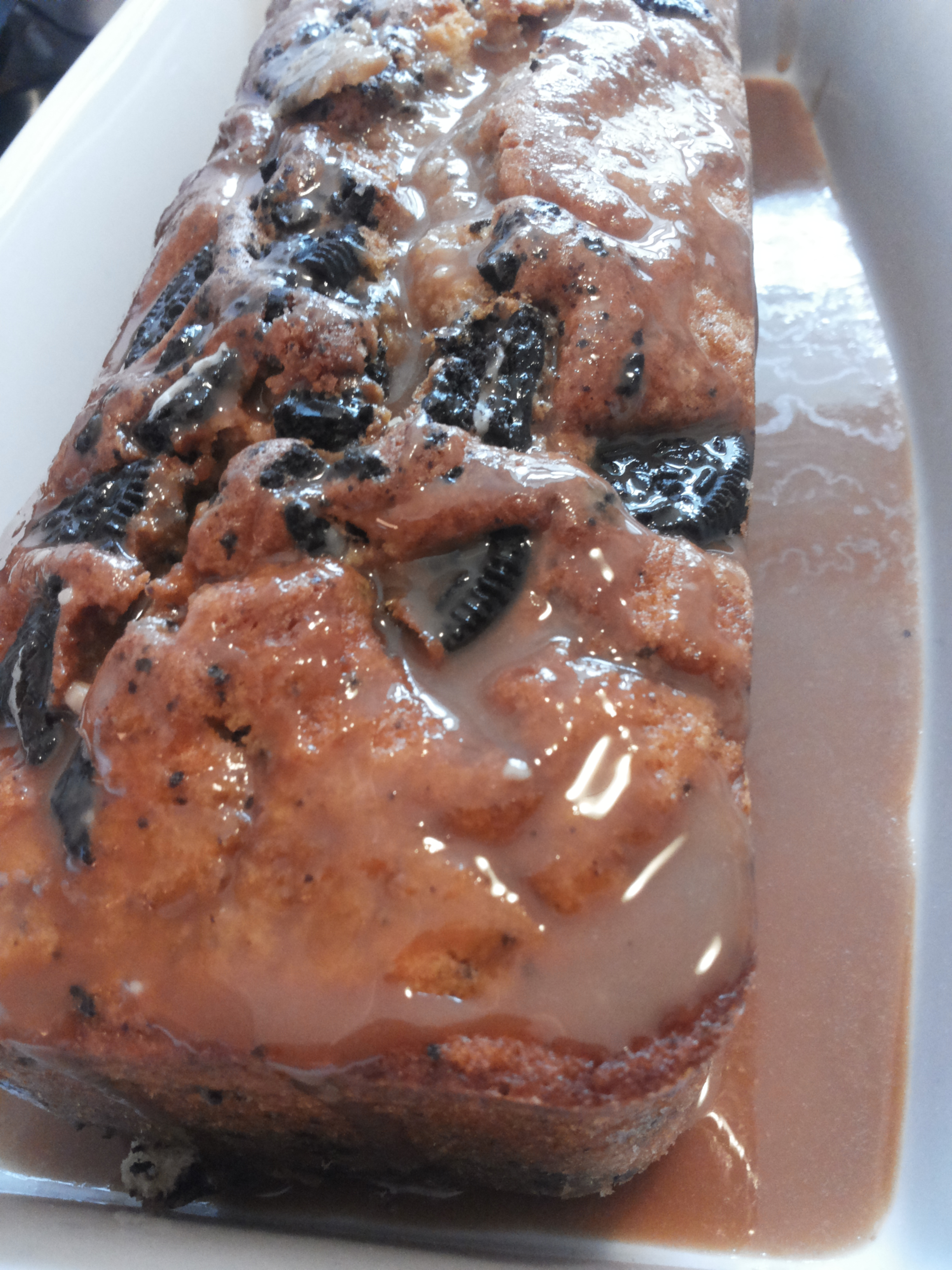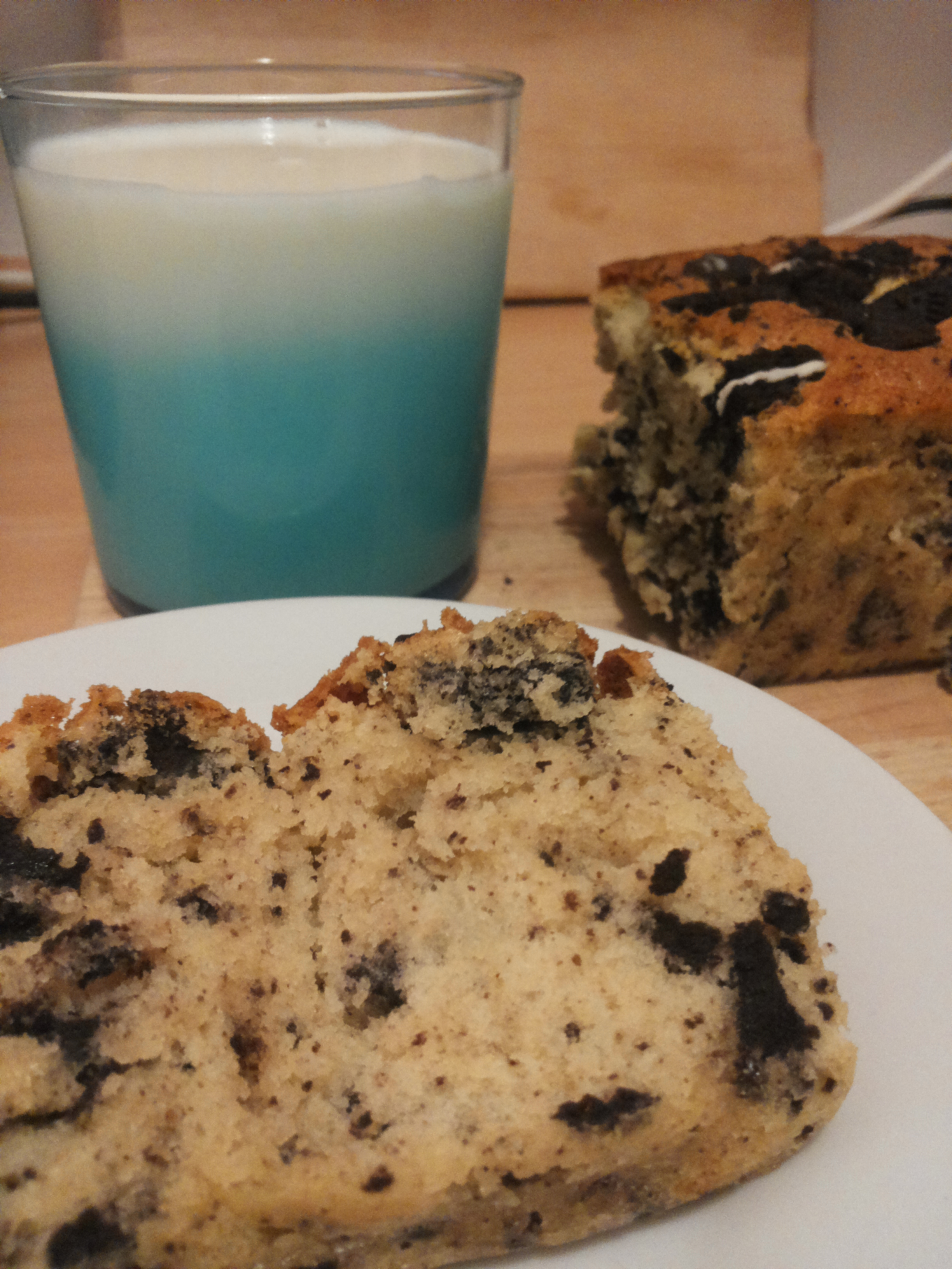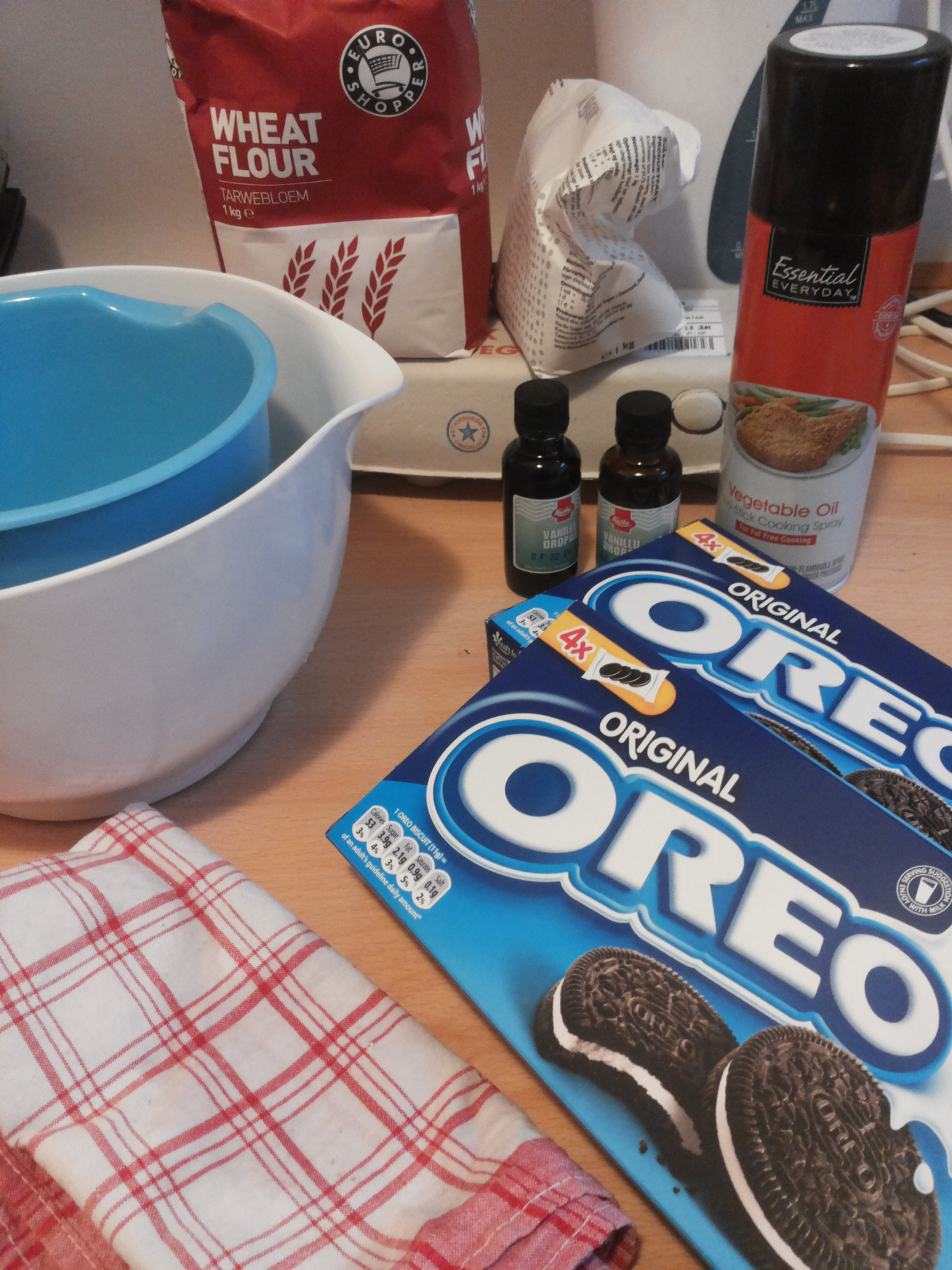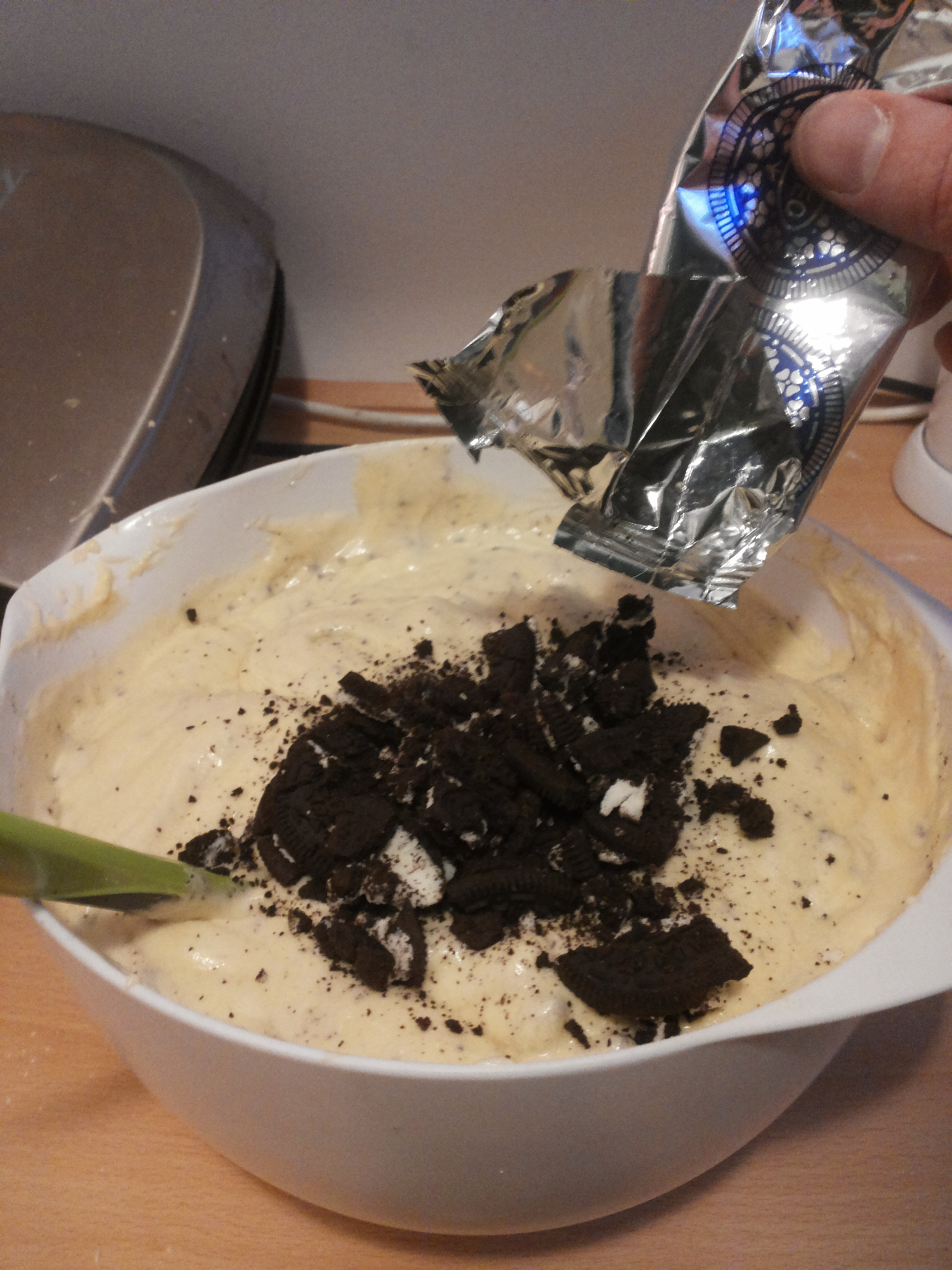 16 Oreo eru svo mulin og blandað saman við, deiginu er svo hellt í stór smurð form (kannski 2, fer eftir stærð) og 8 Oreo eru svo mulin gróft og sett ofan á. Þetta er mjög stór uppskrift (eins og ég lærði þegar ég þurfti að skipta þessu í tvær skálar).