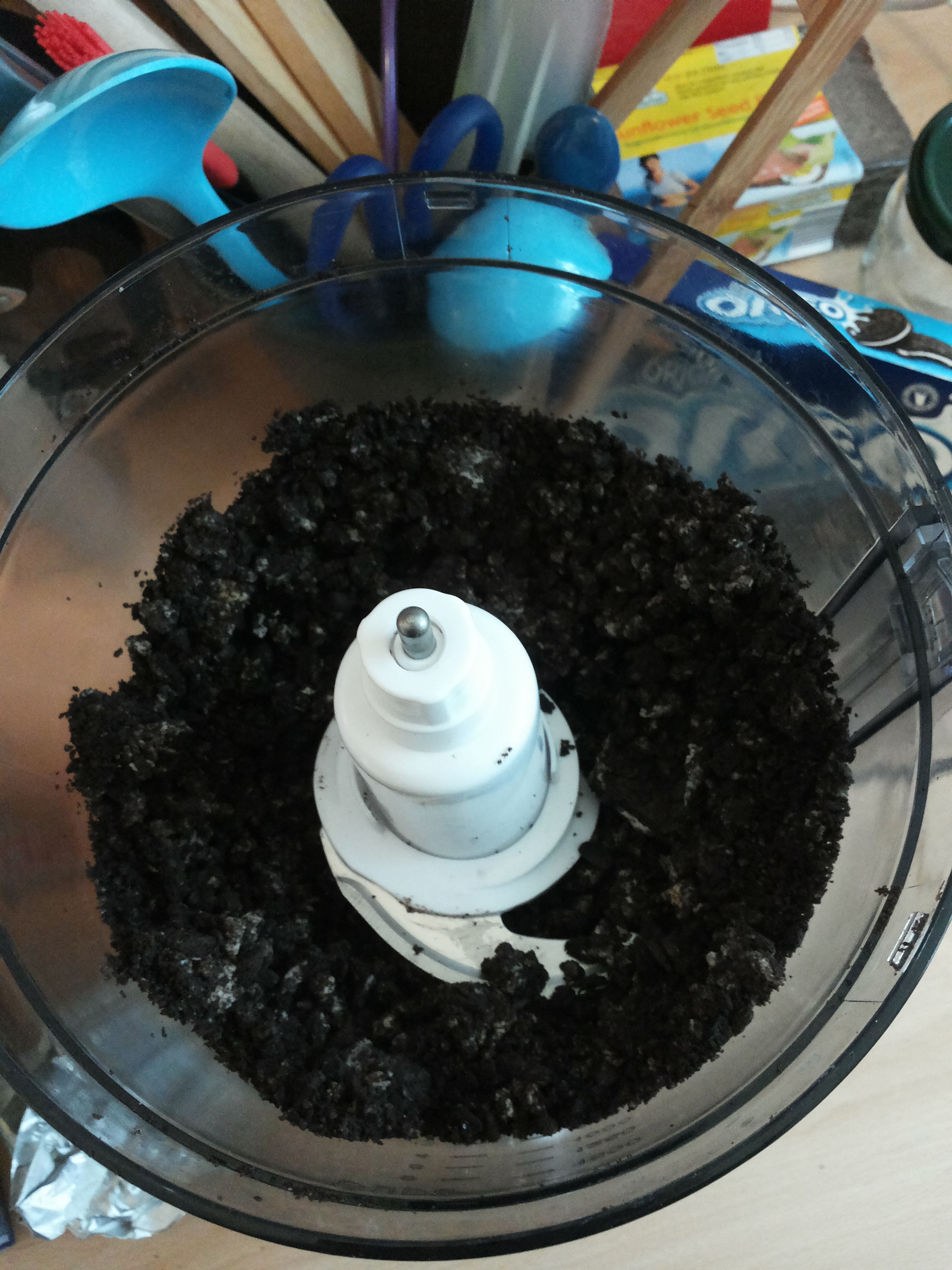 Oreo-ið er mulið saman við smjörið í matvinnsluvél og þjappað í botninn.