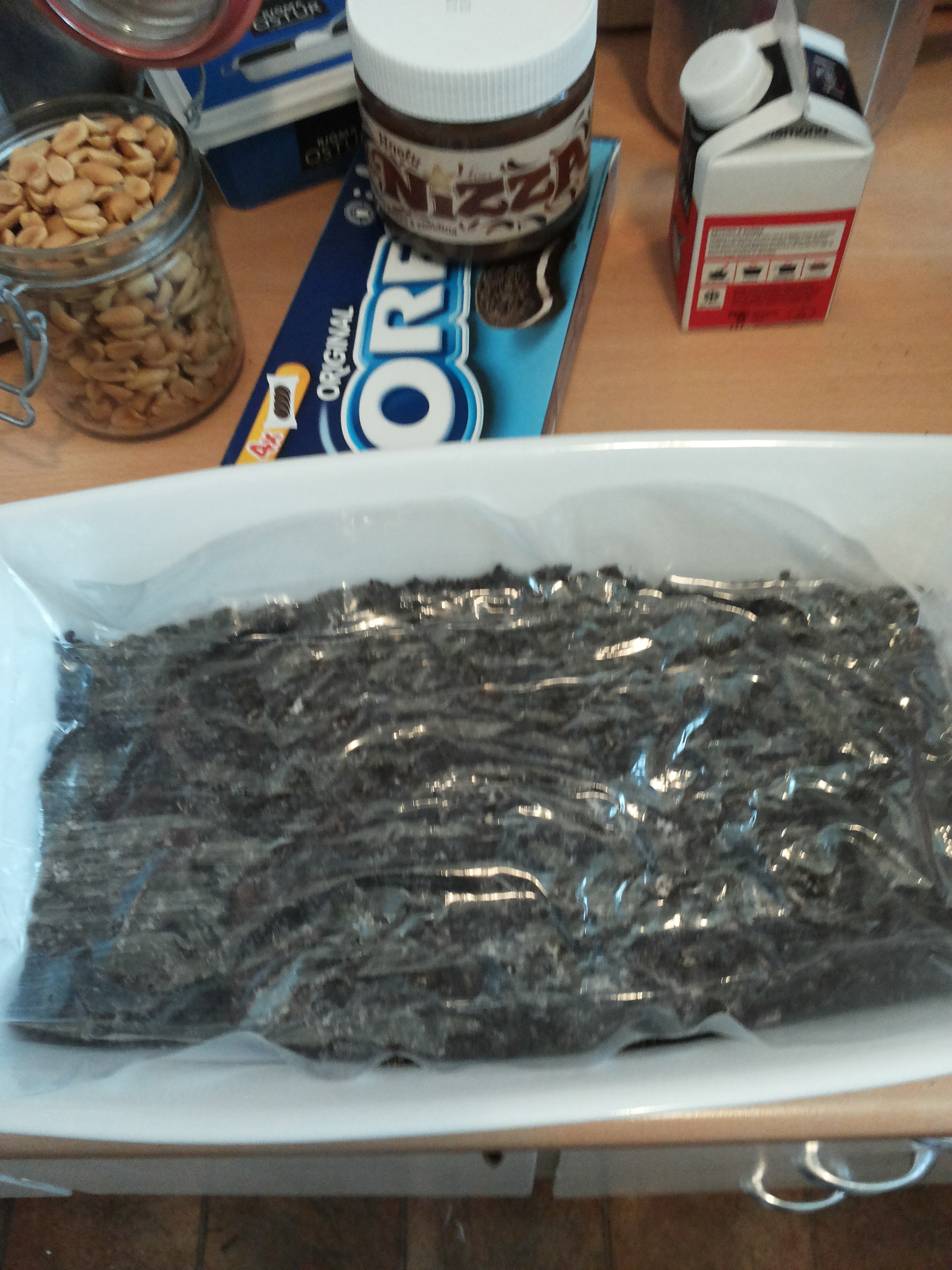 Þessi ostakaka er sem sagt með Oreo kexi í botninum, kremið er samansett af rjómaosti, Nizza súkkulaðinu og þeyttum rjóma.