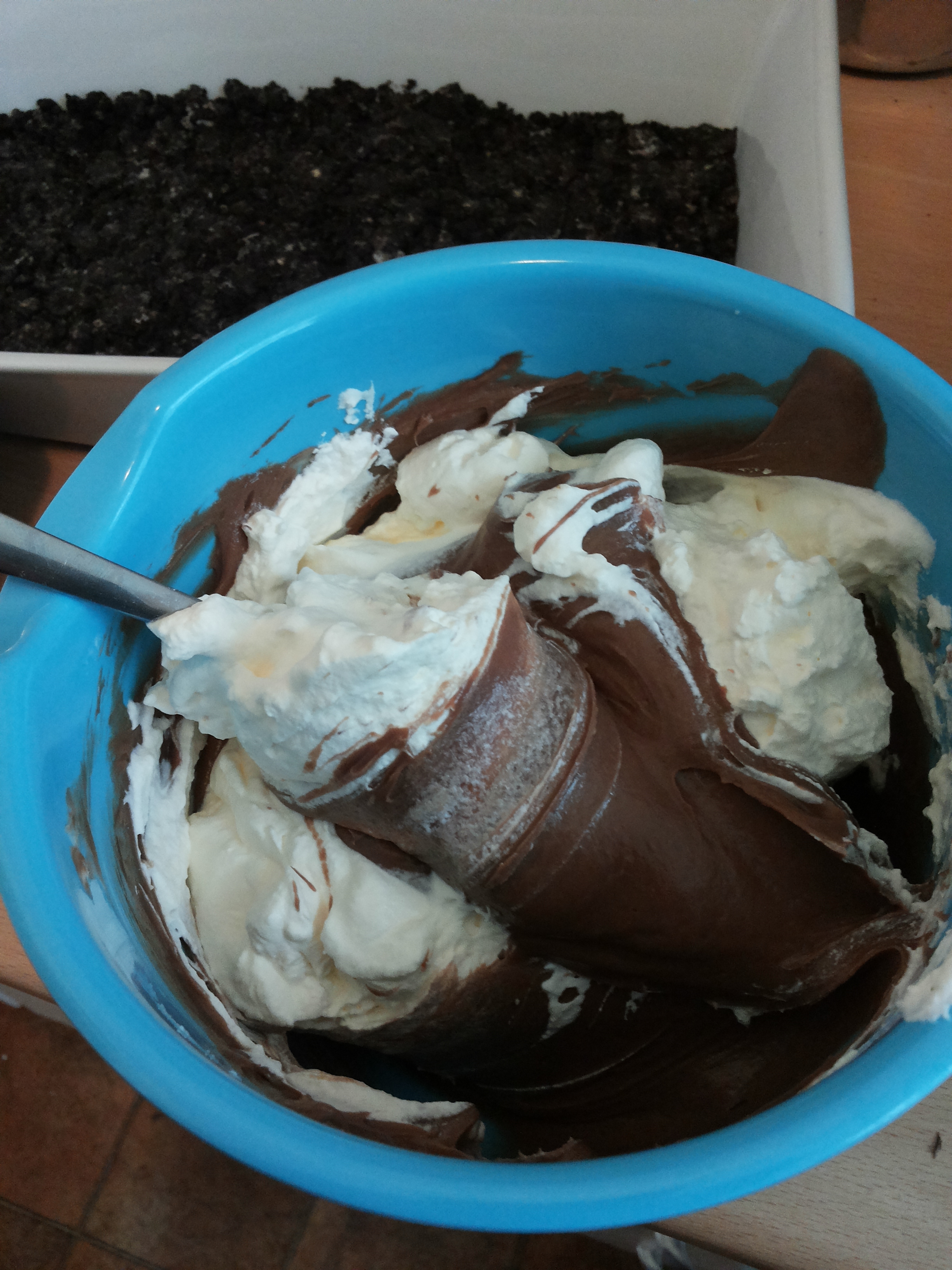 Rjómaosturinn og Nizzað er hrært vel saman. Þeytta rjómanum er svo blandað saman og smurt ofan á botninn.