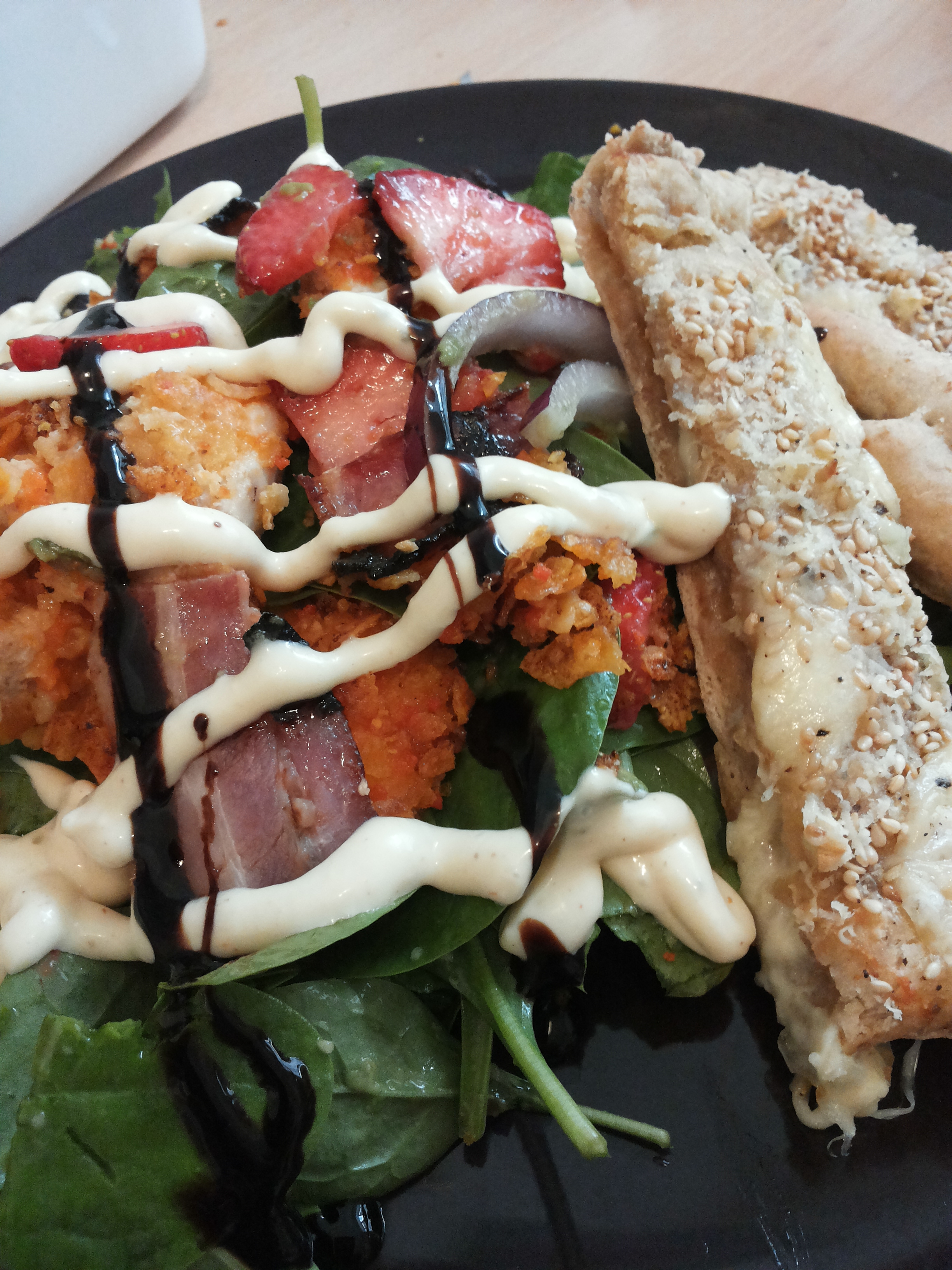 Salatið er svo borið fram með góðri sinnepssósu og jafnvel balsamikedik. Salatið og brauðið talar vel saman, það er einhver stemming í þessu, grillaða baconið gefur þessi ákveðið kikk á móti sætunni frá jarðaberjunum.