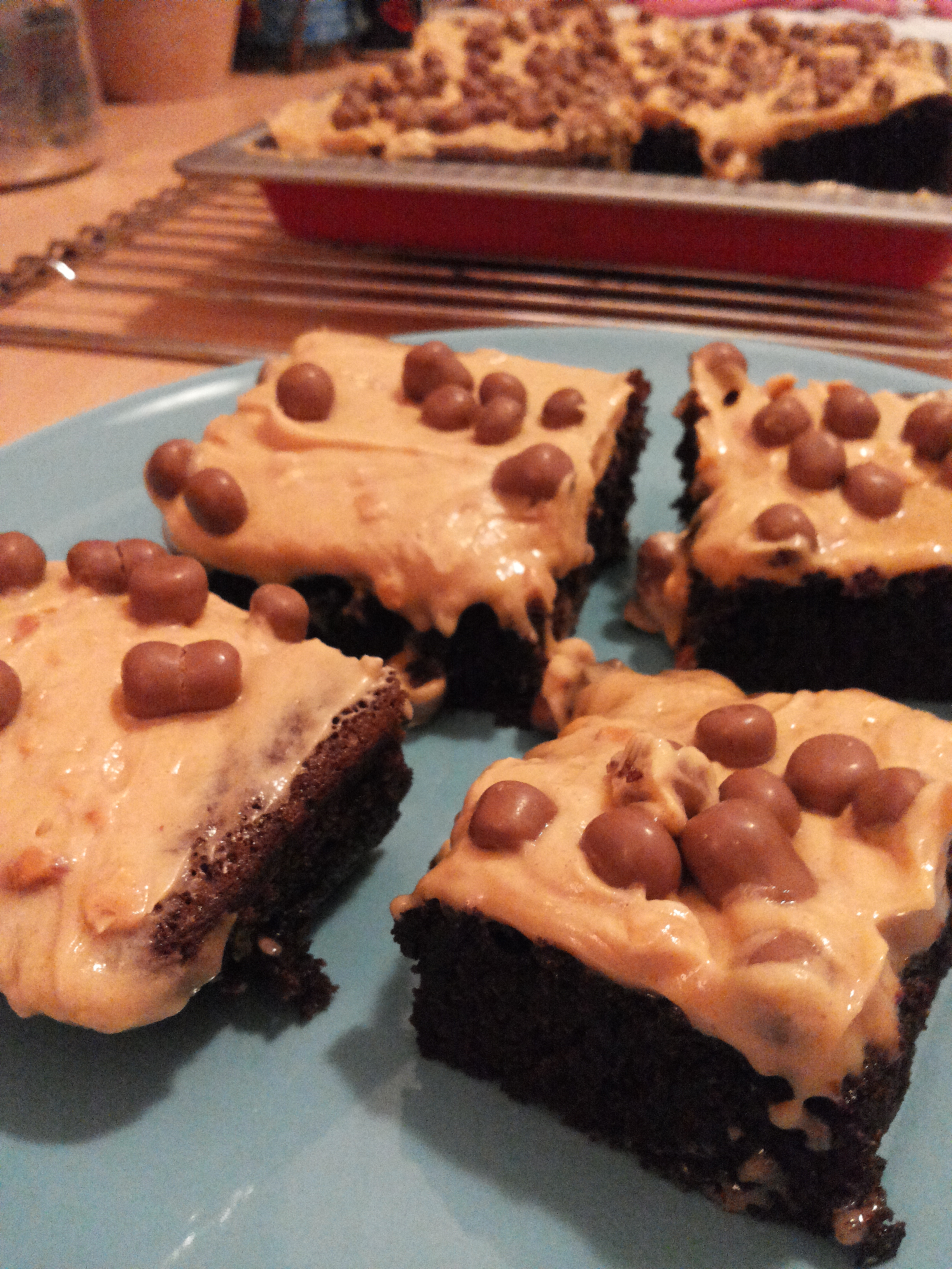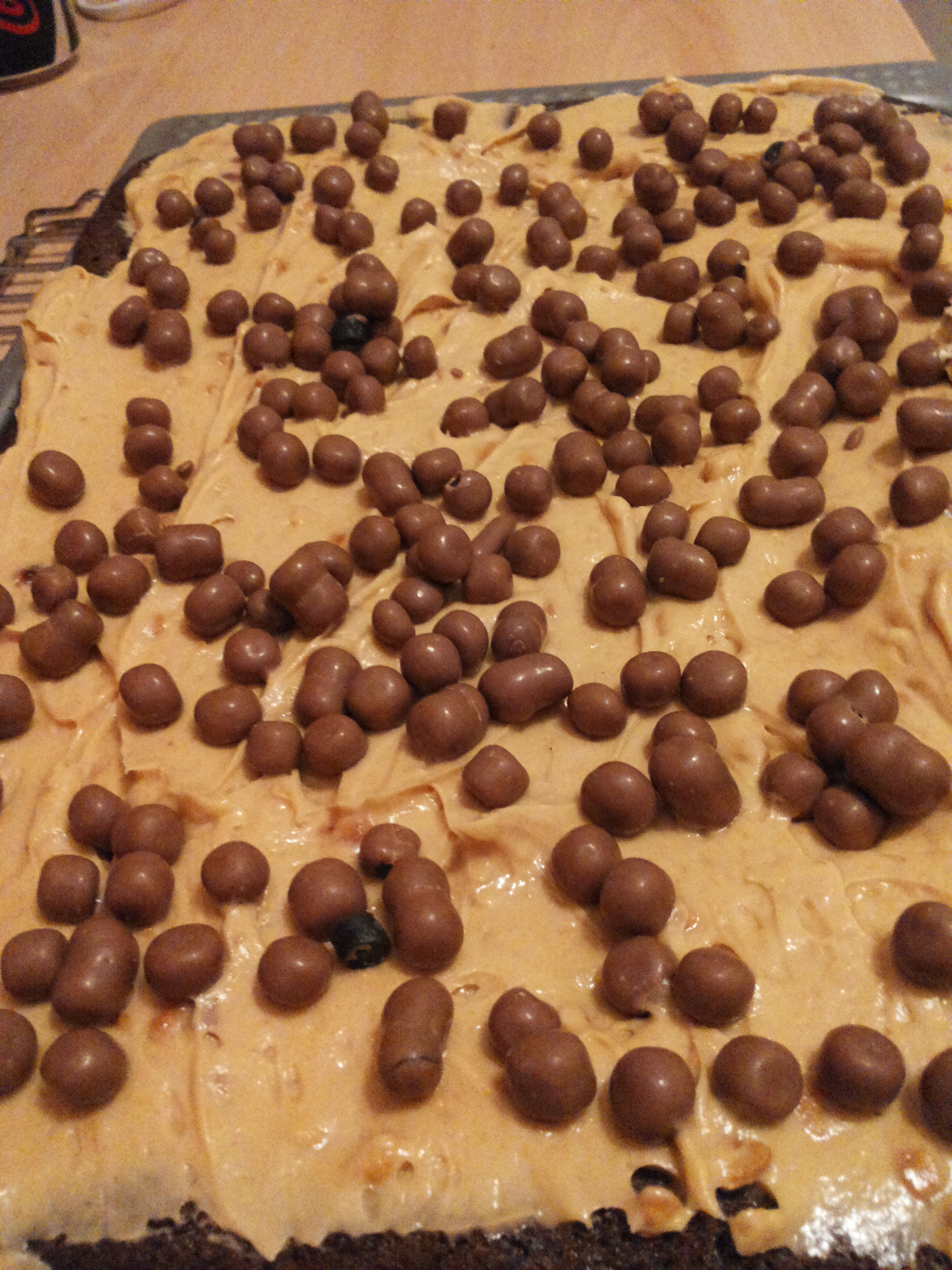 Öllu jukkinu þeytt vel saman og smurt á kalda kökuna. Nóa Síríus lakkrískurli er svo dreift yfir.