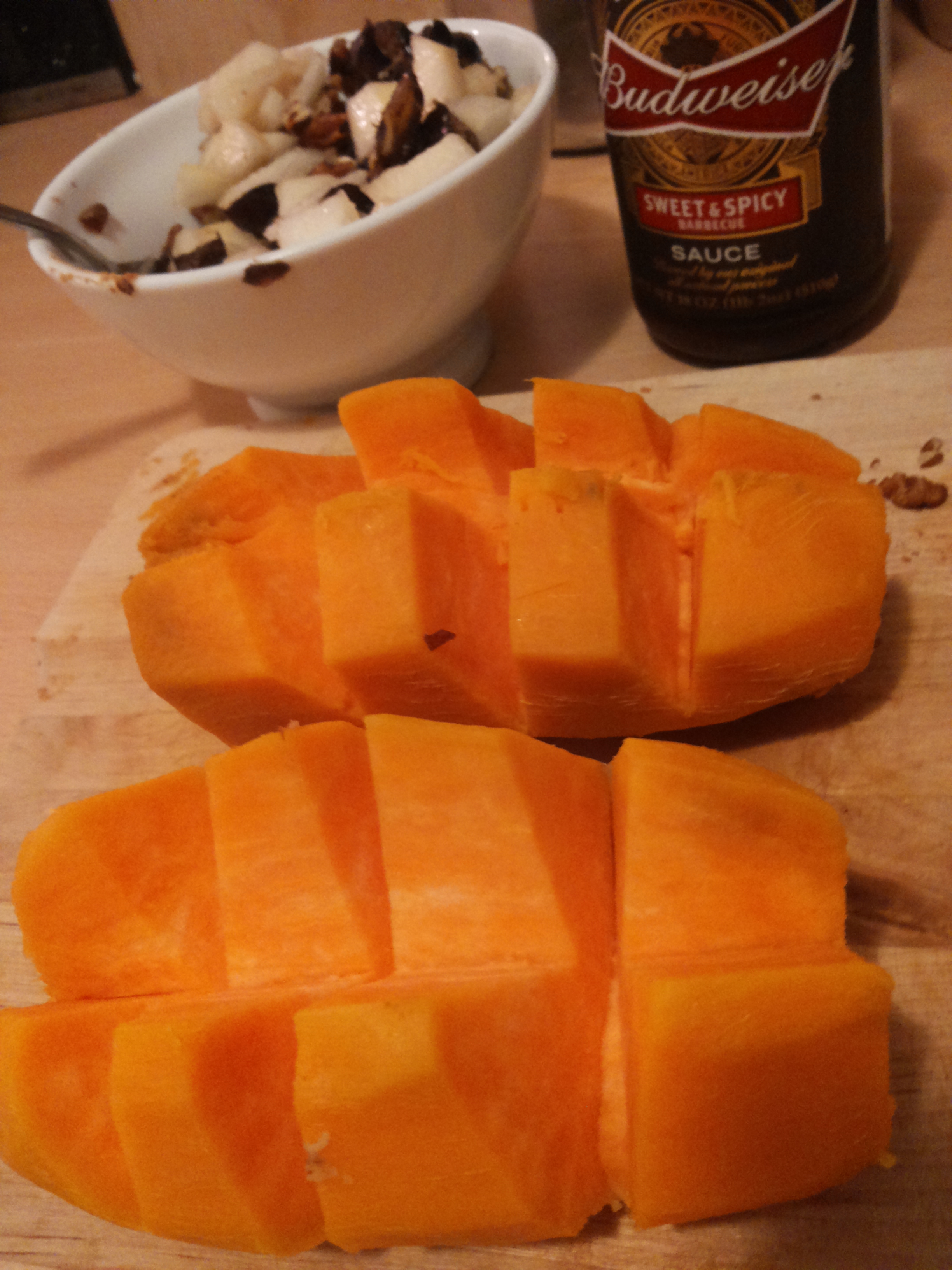 Peran og döðlurnar eru smátt skornar, hneturnar aðeins grófari, hrært saman við ólívuolíu og kryddað með anís eftir smekk.