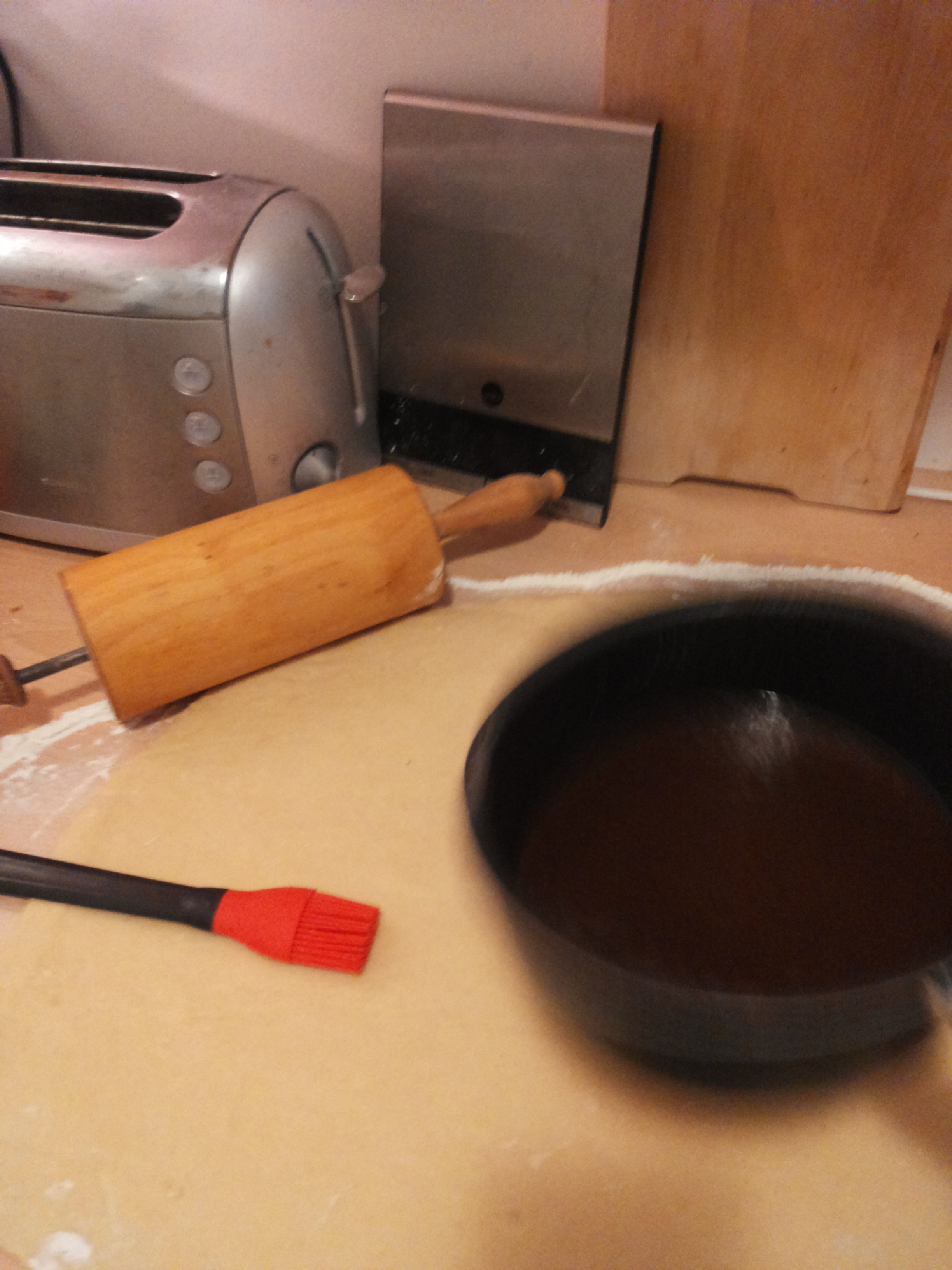 Þurrefnunum er blandað vel saman svo er hinu bætt útí einu af öðru, hnoðað vel og látið hefa sig í ca 30 mín. Hnoðað aftur og flatt út.