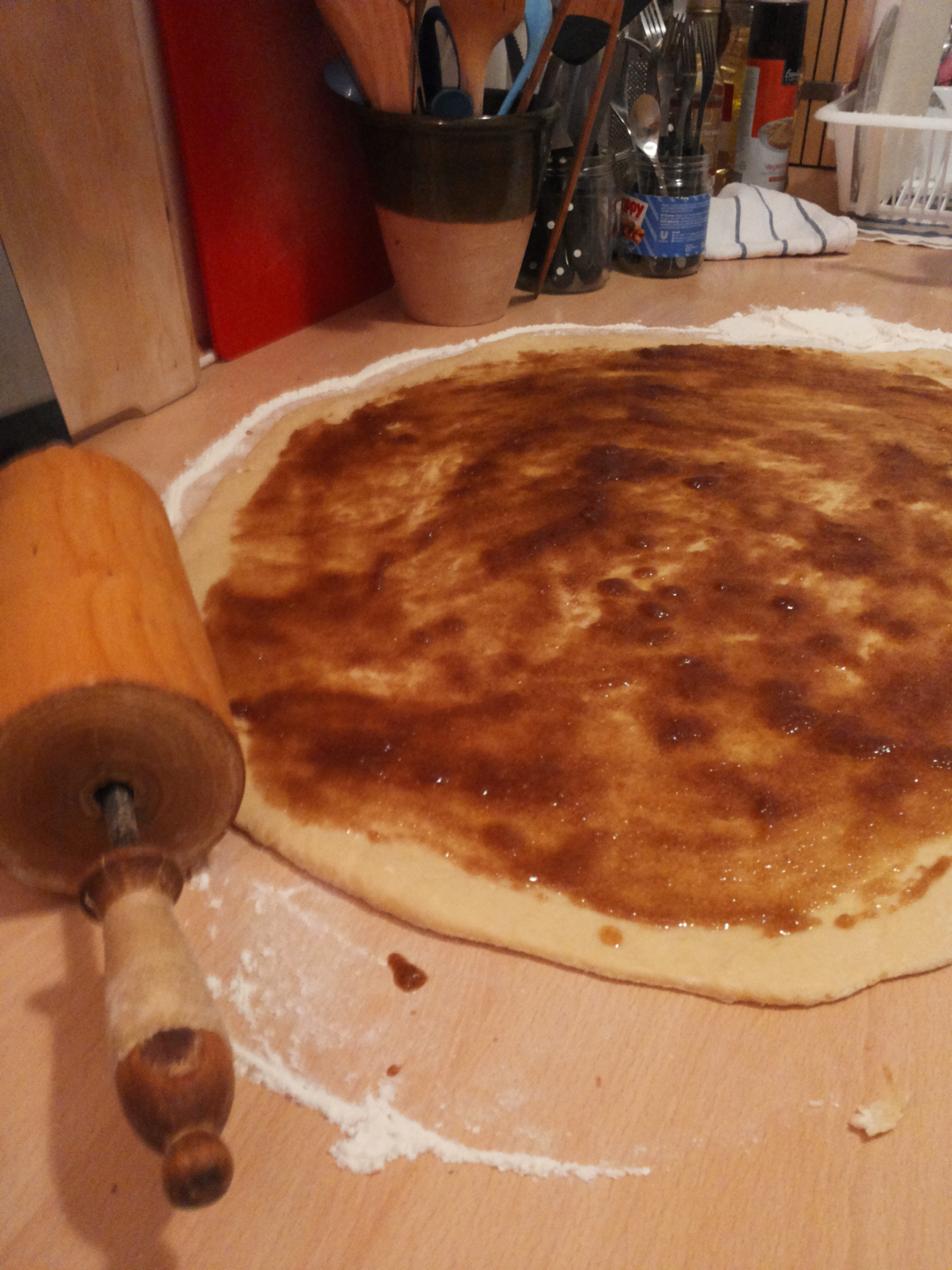 Þessu er síðan smurt á deigið, rúllað upp og skorið í jafna snúða.