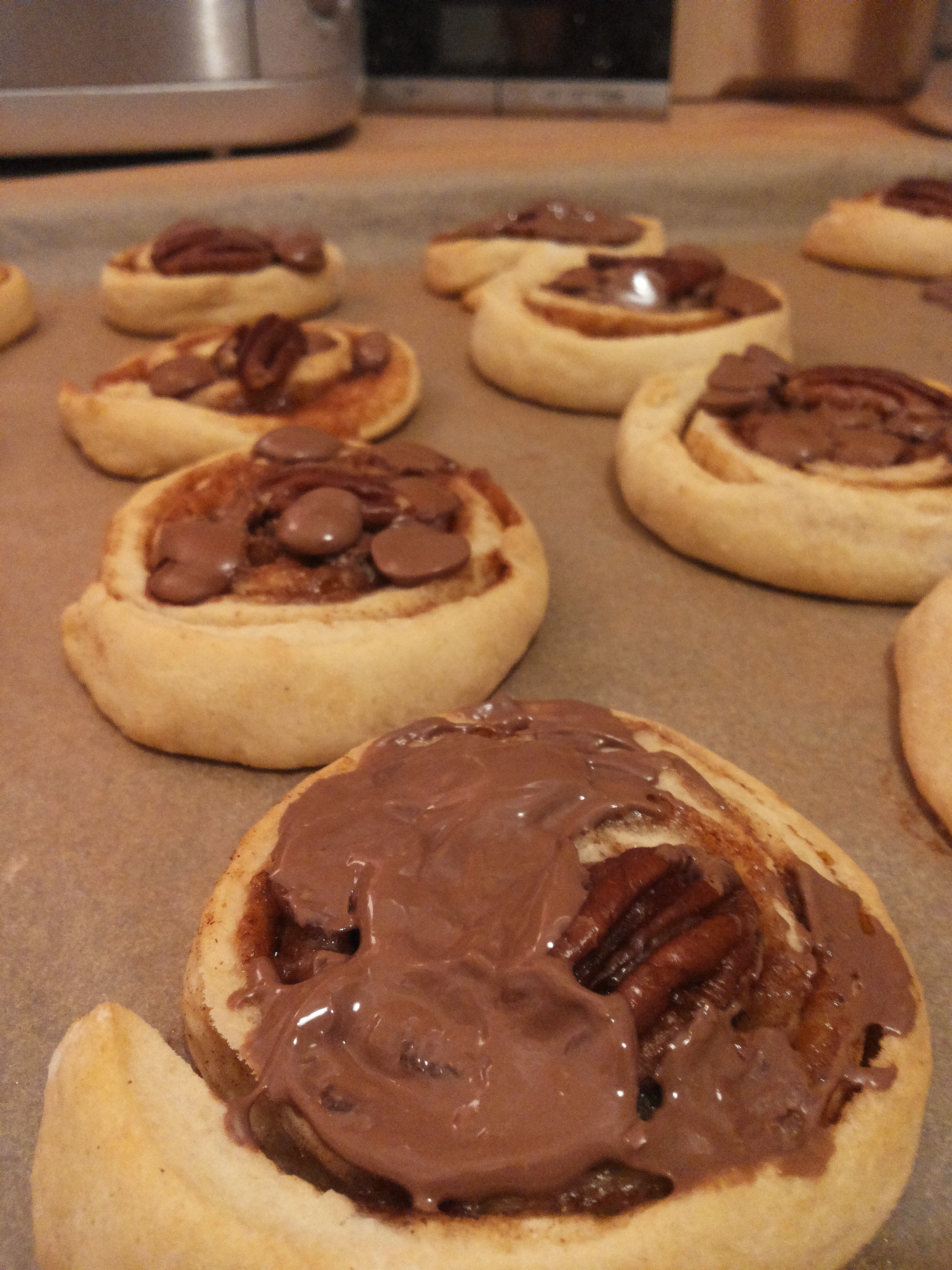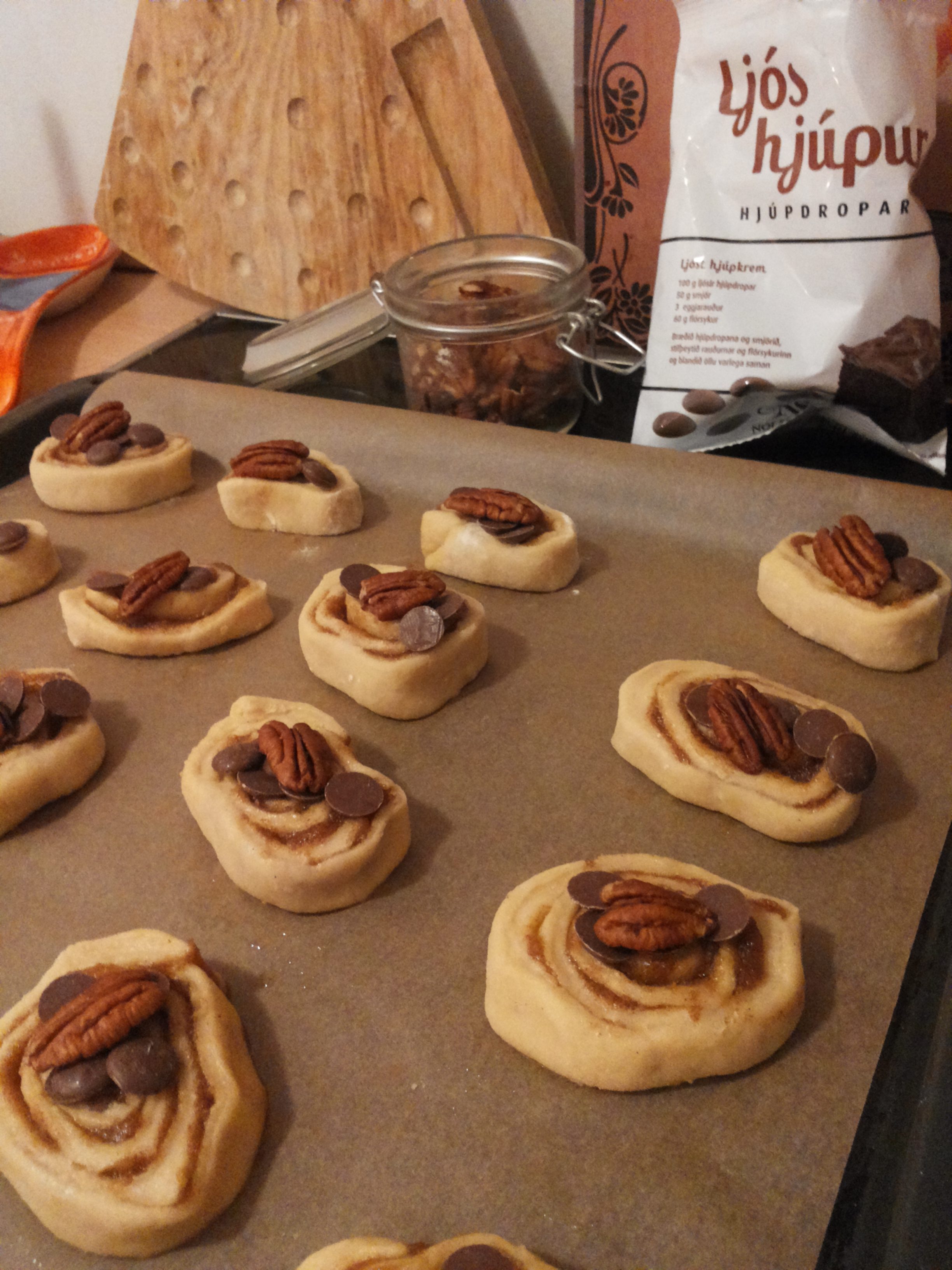 Nokkrir dropar af súkkulaði látnir á hvern snúð og ein hneta.