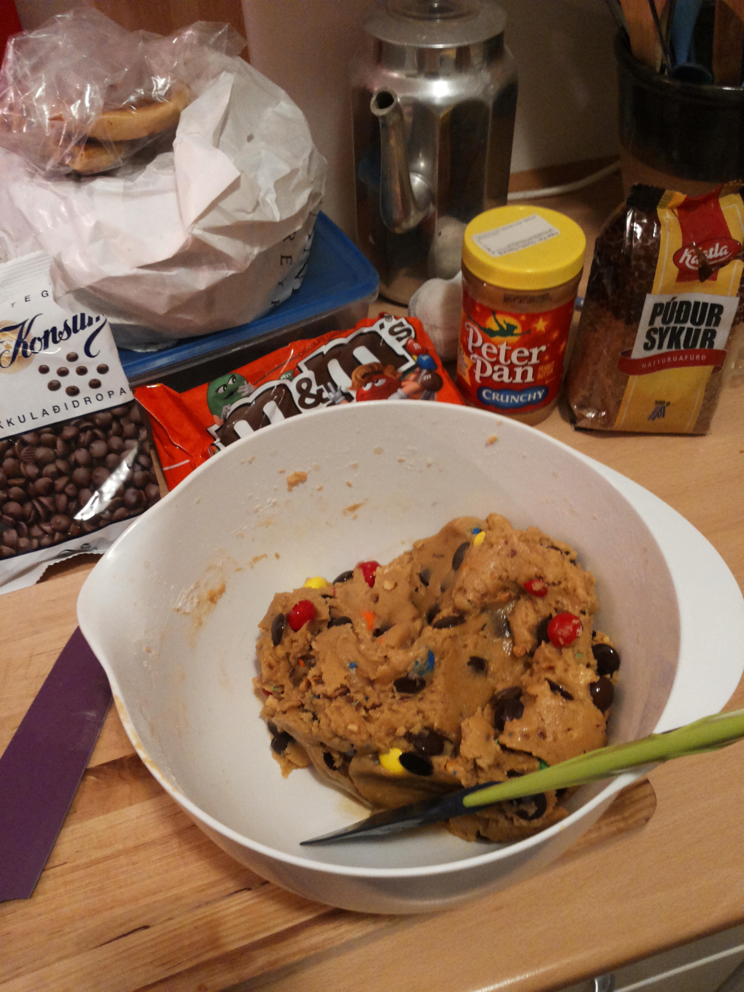 Sykur, púðursykur og smjör er þeytt vel saman, svo eggið og droparnir, svo hnetusmjörið og þá þurrefnin. M&M-ið er kramið og lamið létt og bætt útí ásamt súkkulaðidropunum.