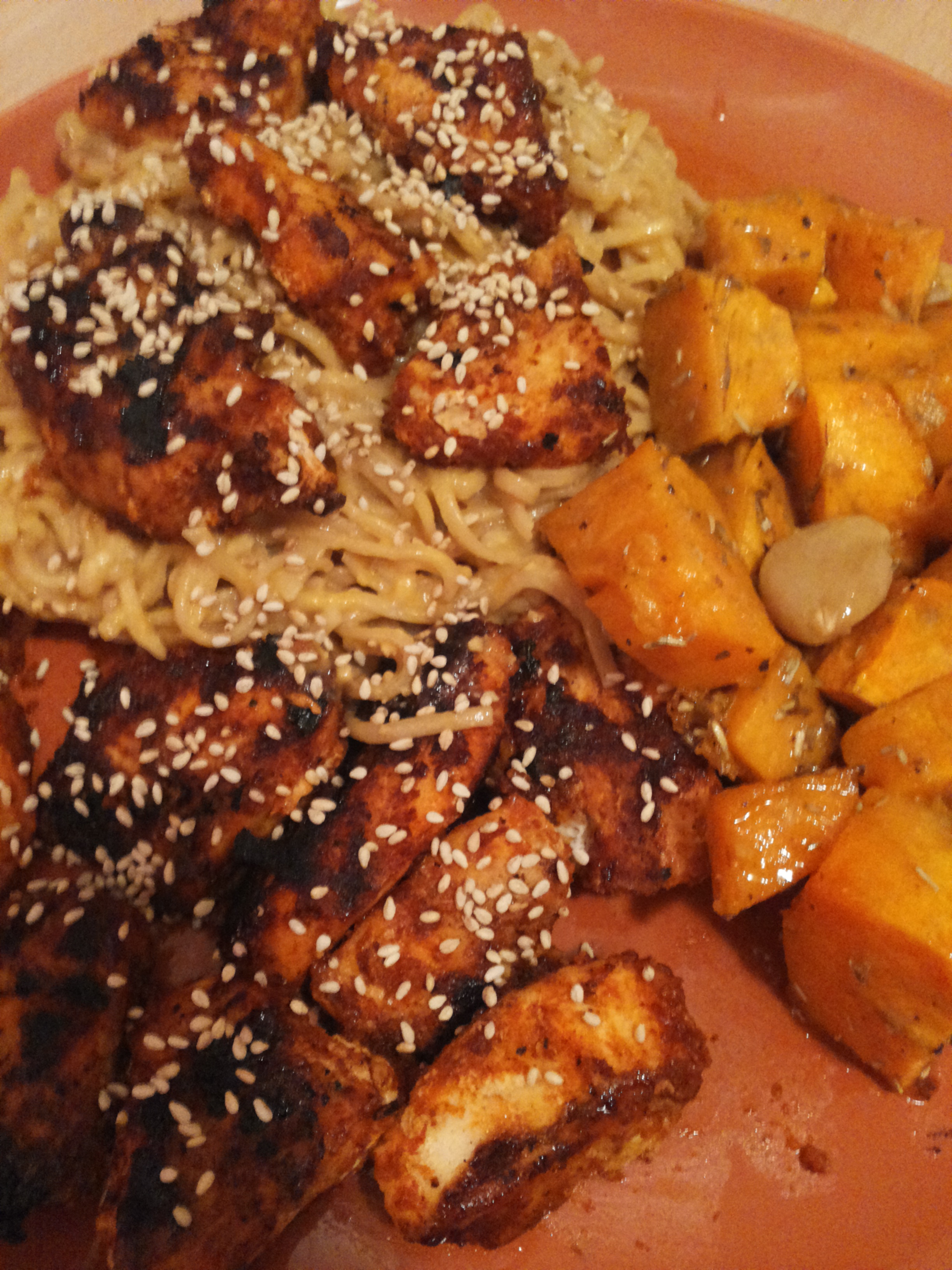 Barbíkjú og hnetubragðið fer svo vel saman og ég setti smá sesam hnetur yfir allt til að fá smá crunch. Hvítlaukurinn verður dásamlega sætur og þetta einhvern veginn tónaði allt vel saman.