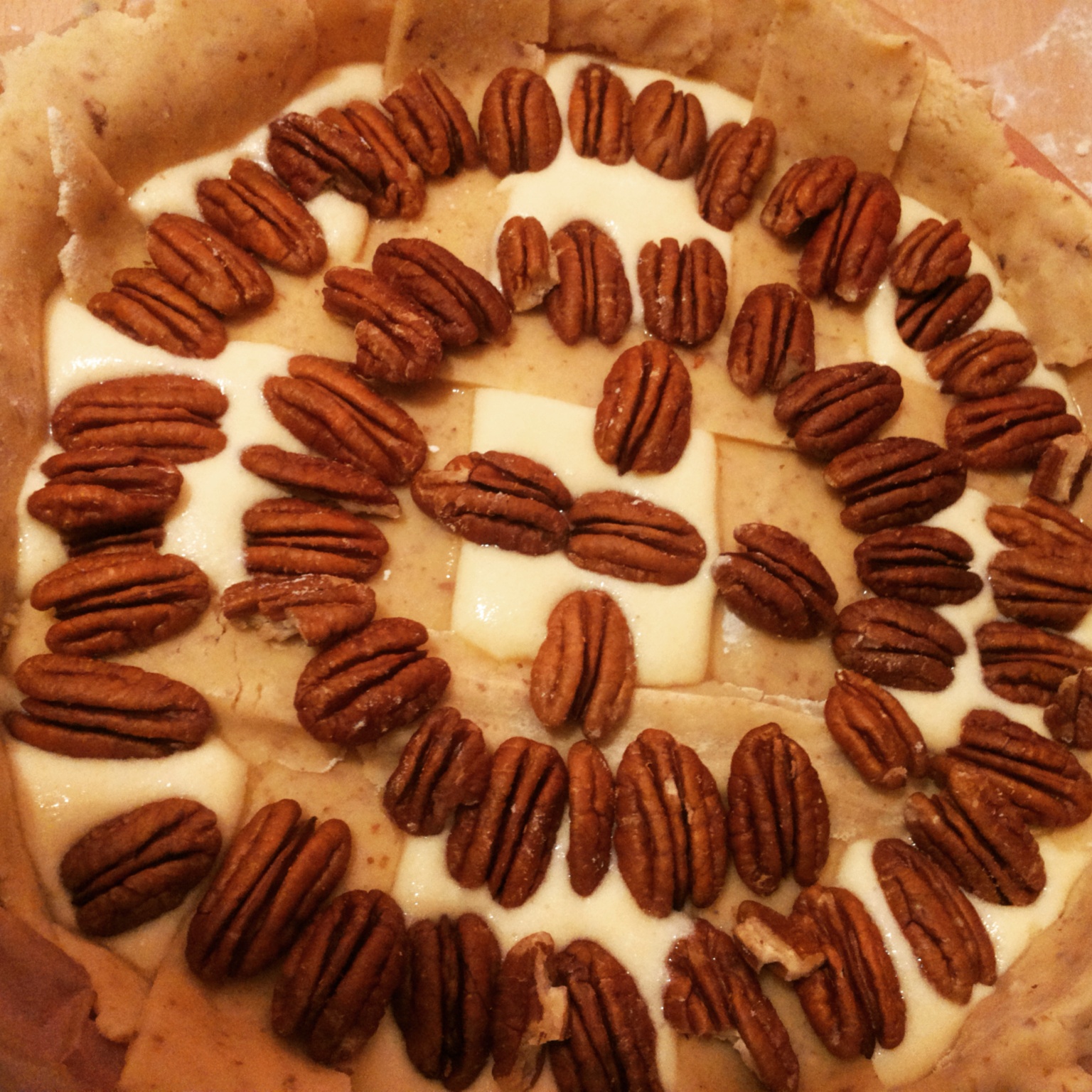 Deigið er tekið úr ísskápnum og 150gr af pekanhnetum eru muldar og settar á botninn svo að þekji, gumsinu er svo hellt yfir og ef við eigum afgangsdeig er tilvalið að gera eitthvað dúllerí á toppinn og raða svo restinni af hnetunum upp í exótískt mynstur.