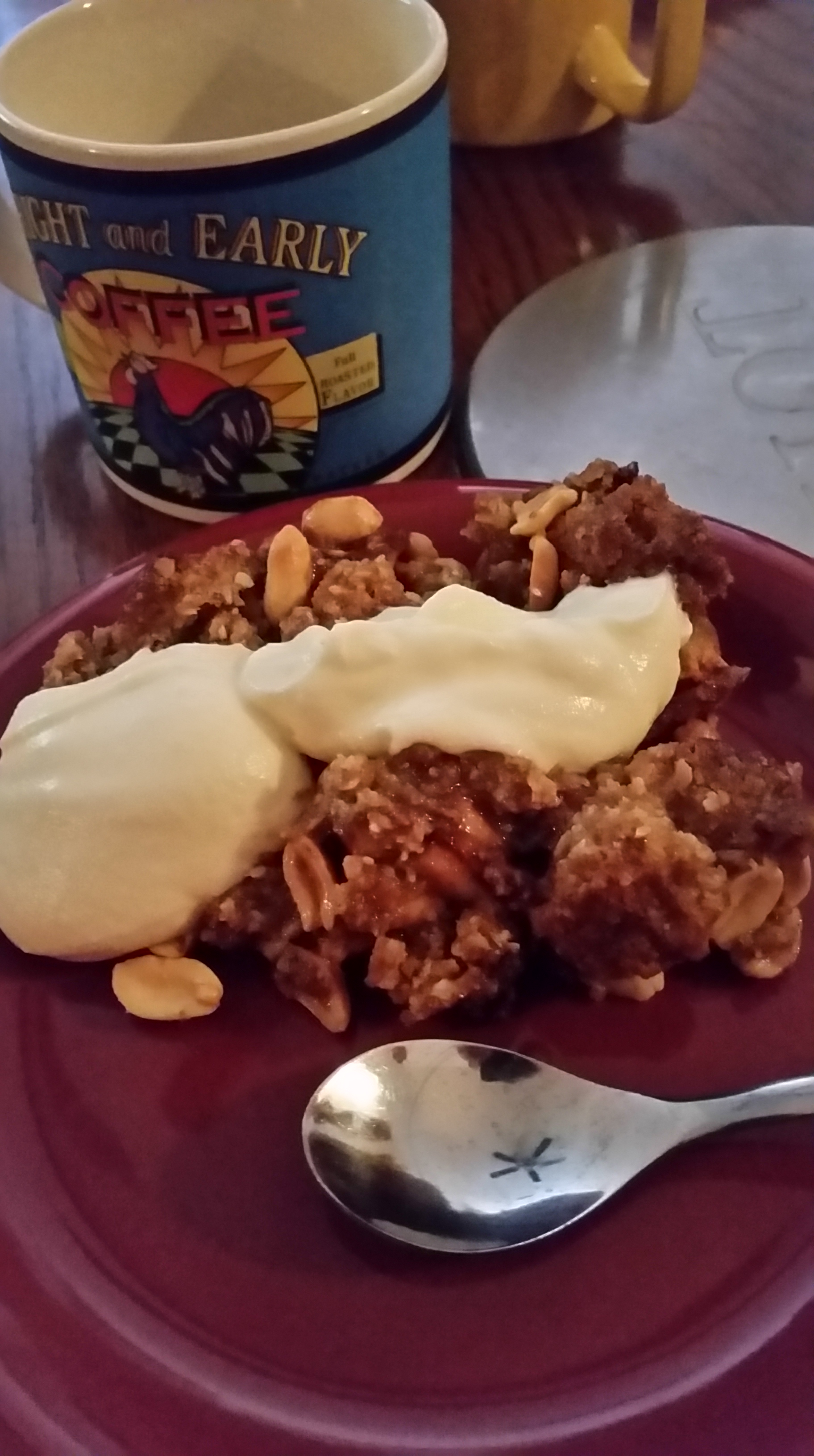 Púðursykur, hveiti, haframjöl og smjör er sett í matvinnsluvél og mixað vel saman og svo aðeins hnoðað, deigið er svo mulið í grófum bitum yfir fatið, salthnetum er síðan dreift yfir eftir smekk, ég set frekar mikið, ég elska bragð af brenndum hnetum.