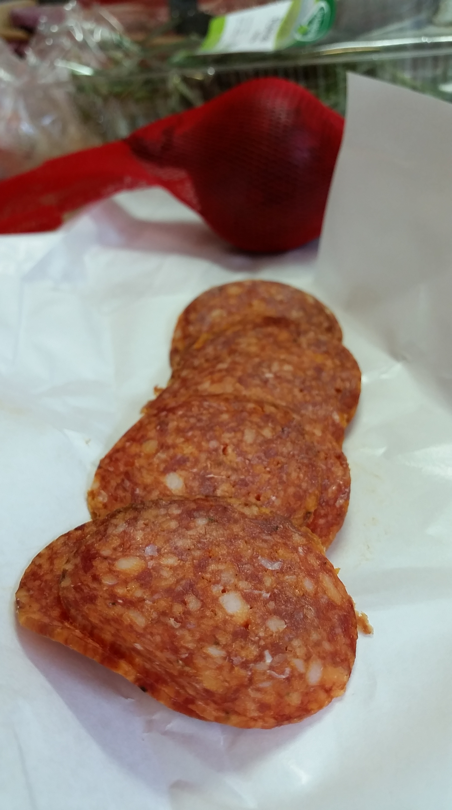 Ég fór í Pylsumeistarann við Laugalæk, sem er einn af föstum punktum í tilveru minni á laugardagsmorgnum, ég keypti þetta venjulega, 6 sneiðar af skinku og svo ætlaði ég að velja eitthvað fínt pepperoni eða pylsu.