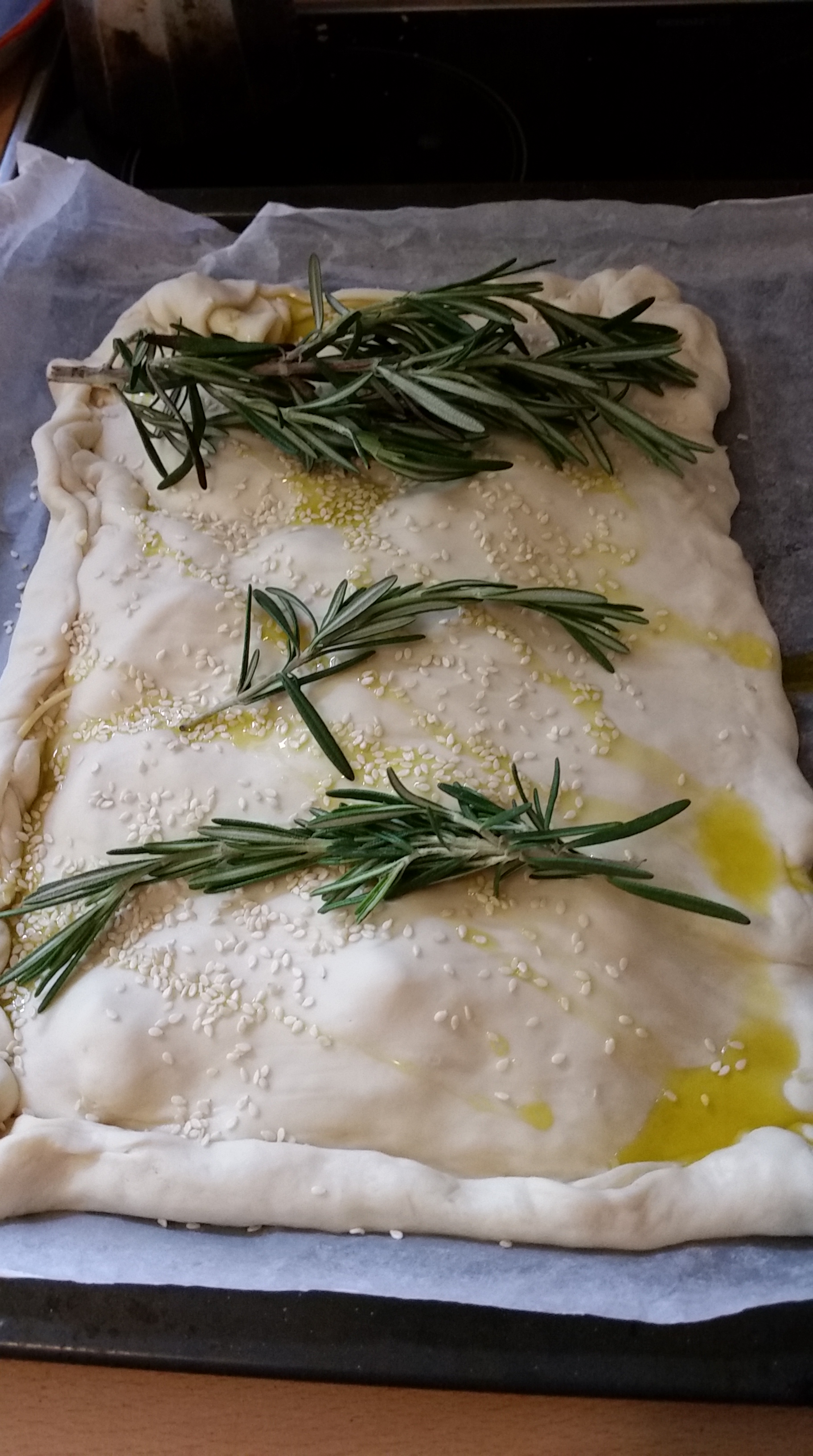 Þetta er mjög einfalt, sósa og rifinn ostur er settur á hvorn helminginn en ekki útí kantana, svo er áleggið sett inn, helmingurinn lagður ofan á og þéttað saman svo það leki ekkert út. Ólívuolíu drislað yfir og sesamfræ, rósmarín stönglar ef maður vill vera fancy.