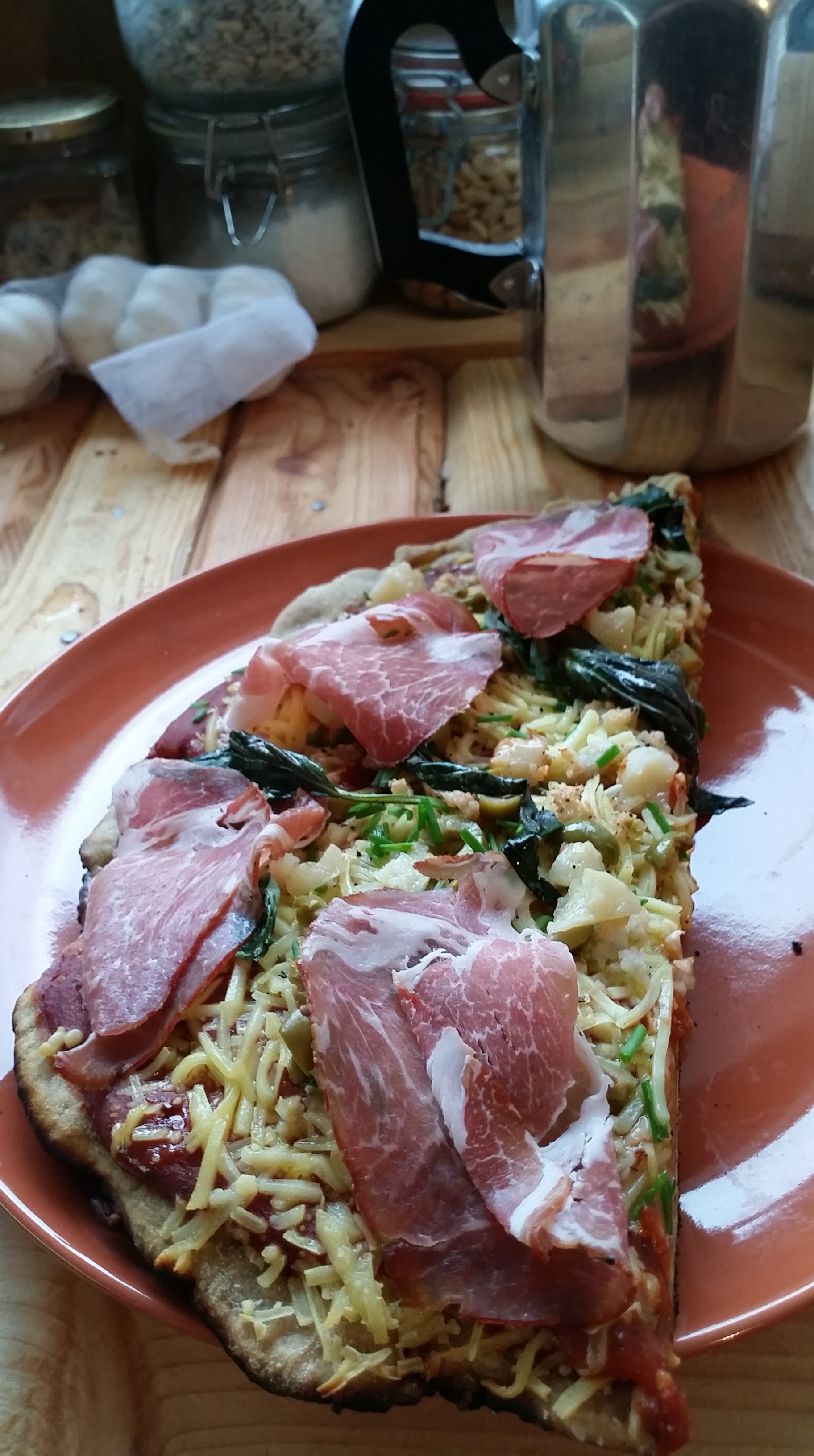Pizzan fór á járnpizzaplatta með töng á grillið og ég setti bara basic sósu, ost og hvítlauk…til að byrja með. Þegar pizzunni var orðið sæmilega hlýtt fóru svo ólívur, graslaukur, basil og parmesan yfir.