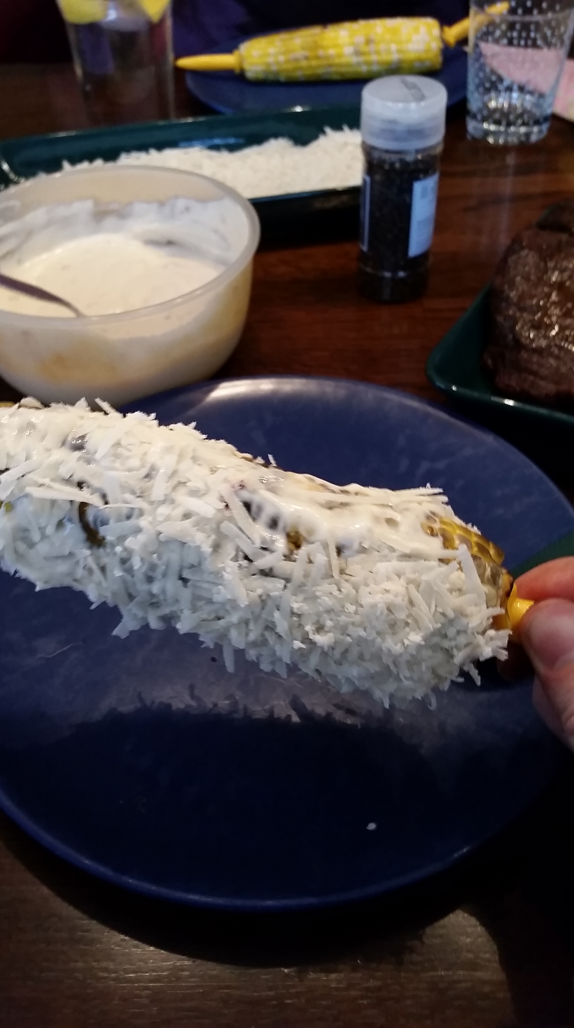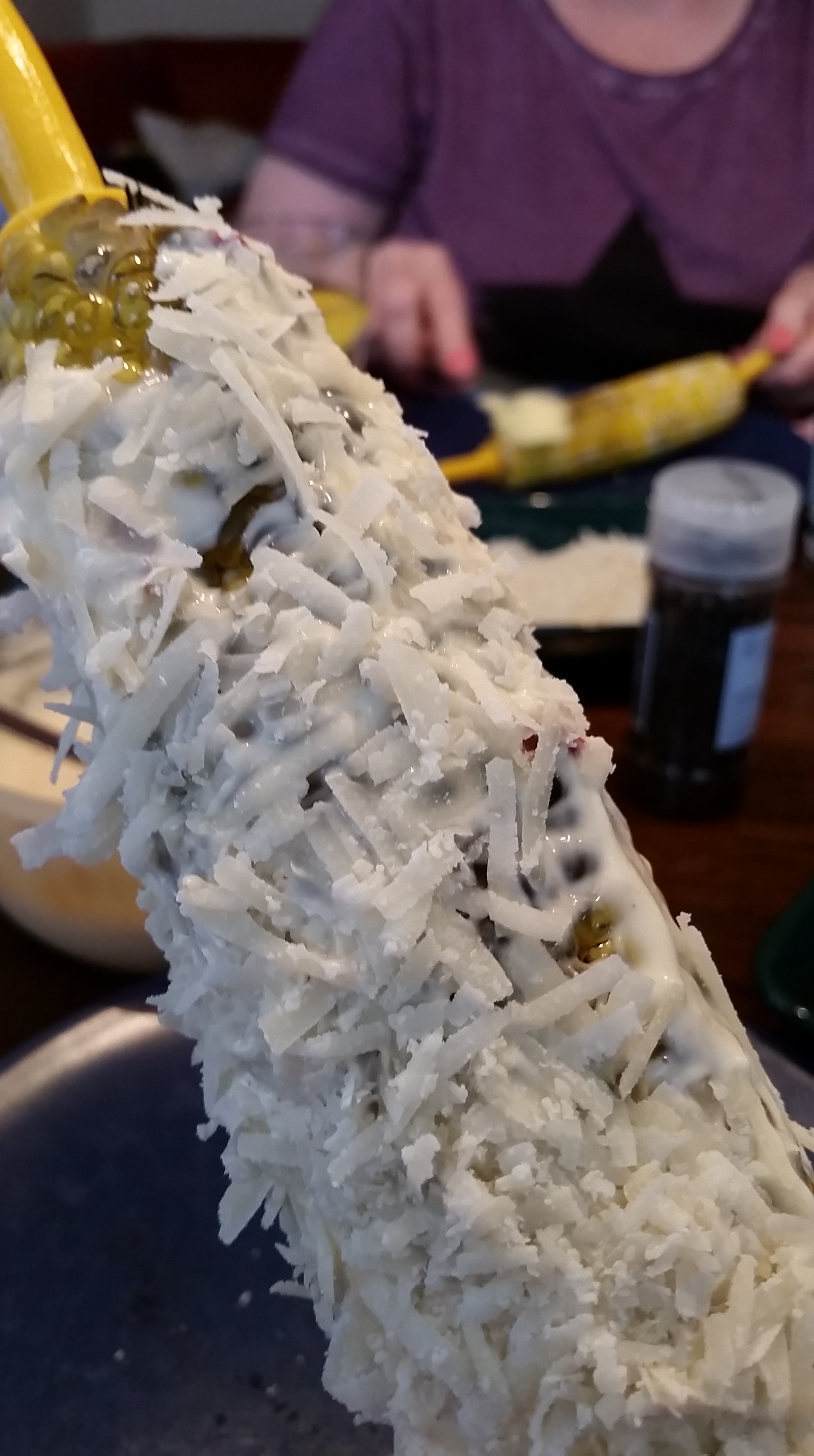 Síðan er maísnum með mæjónesinu á velt upp úr rifnum parmesan.