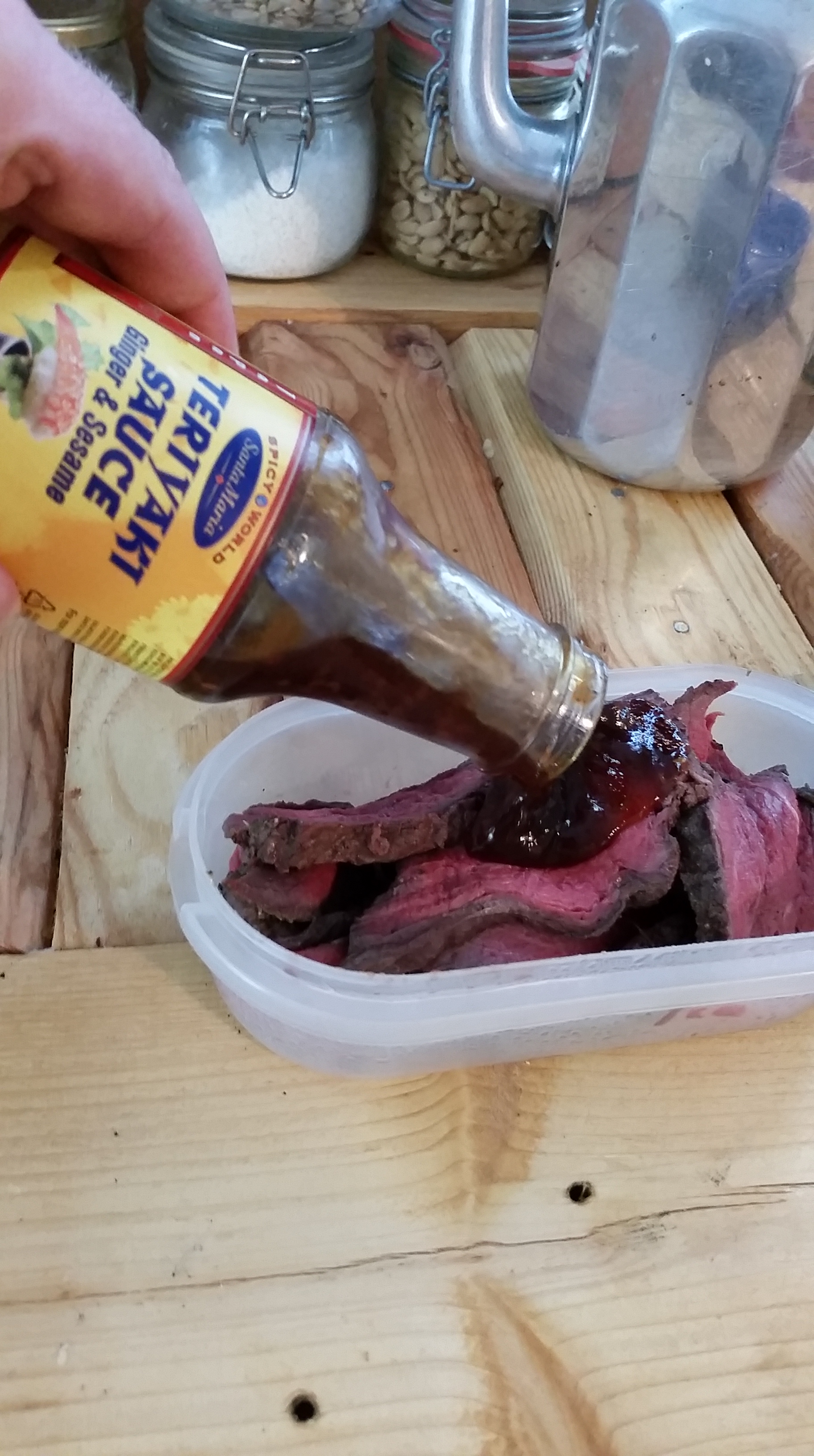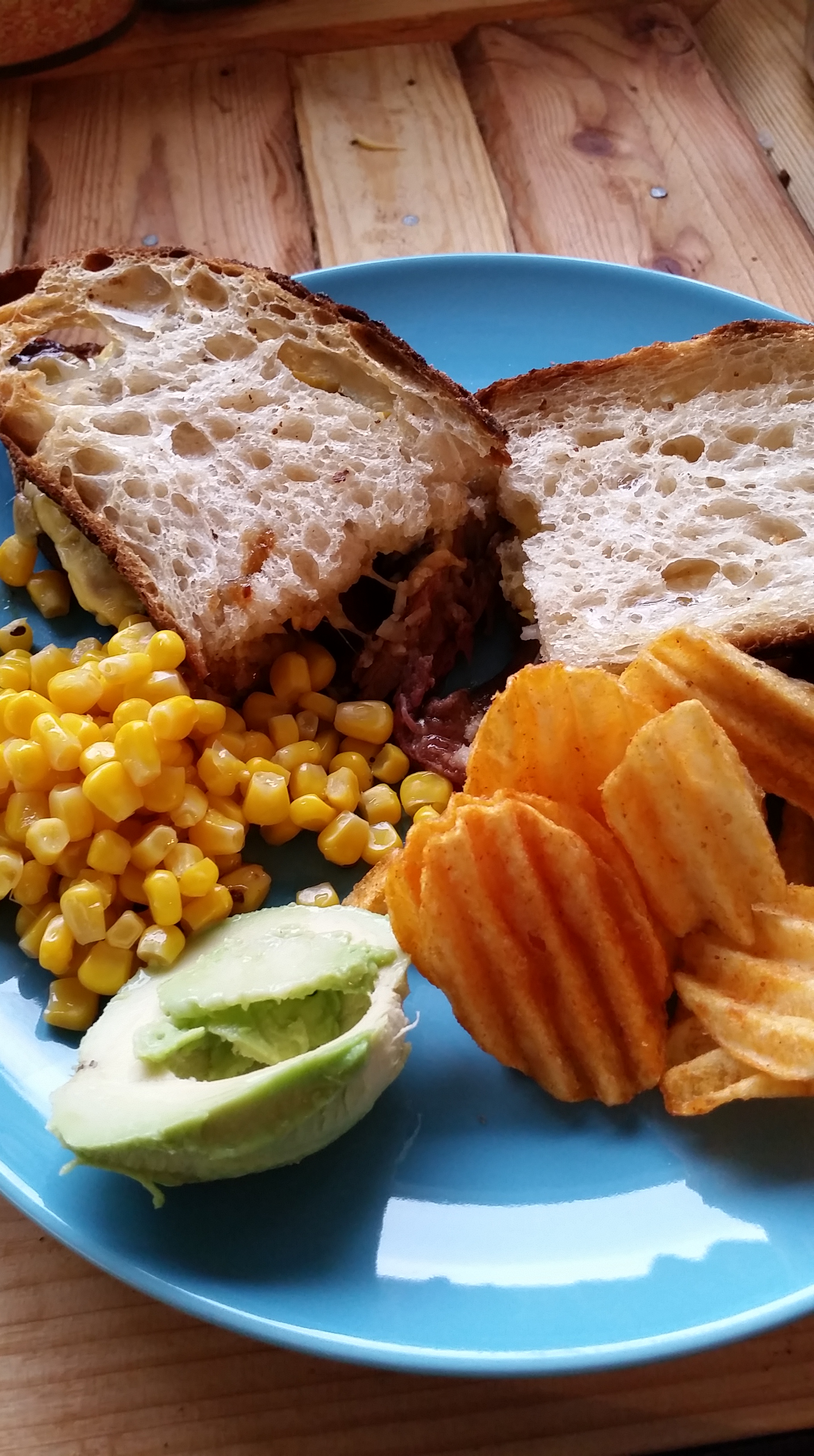 Ég átti afgangs nautakjöt frá matarboði og skar það mjög þunnt og lét það liggja í teriyaki sósu í klukkutíma, brauðið var smurt með ólivu-olíu og ostur fór þar ofan á, þá kjötið svo parmesan í miklu magni, maísbaunir (mmm gular baunir) og svo annað brauð með osti.