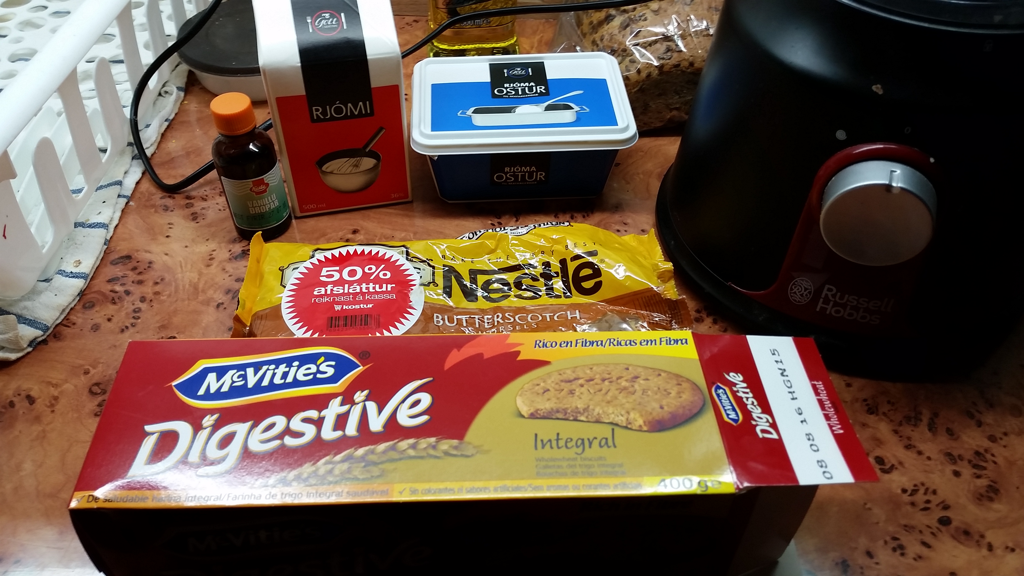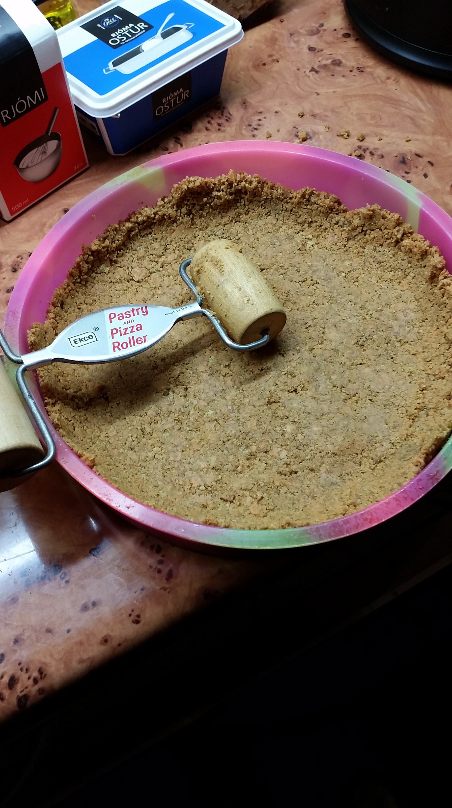 Allt sett í matvinnsluvél og sett í form, flatt út og þétt, passa að móta góða brún, sett í ísskápin meðan hitt er unnið, mjög einfalt.
