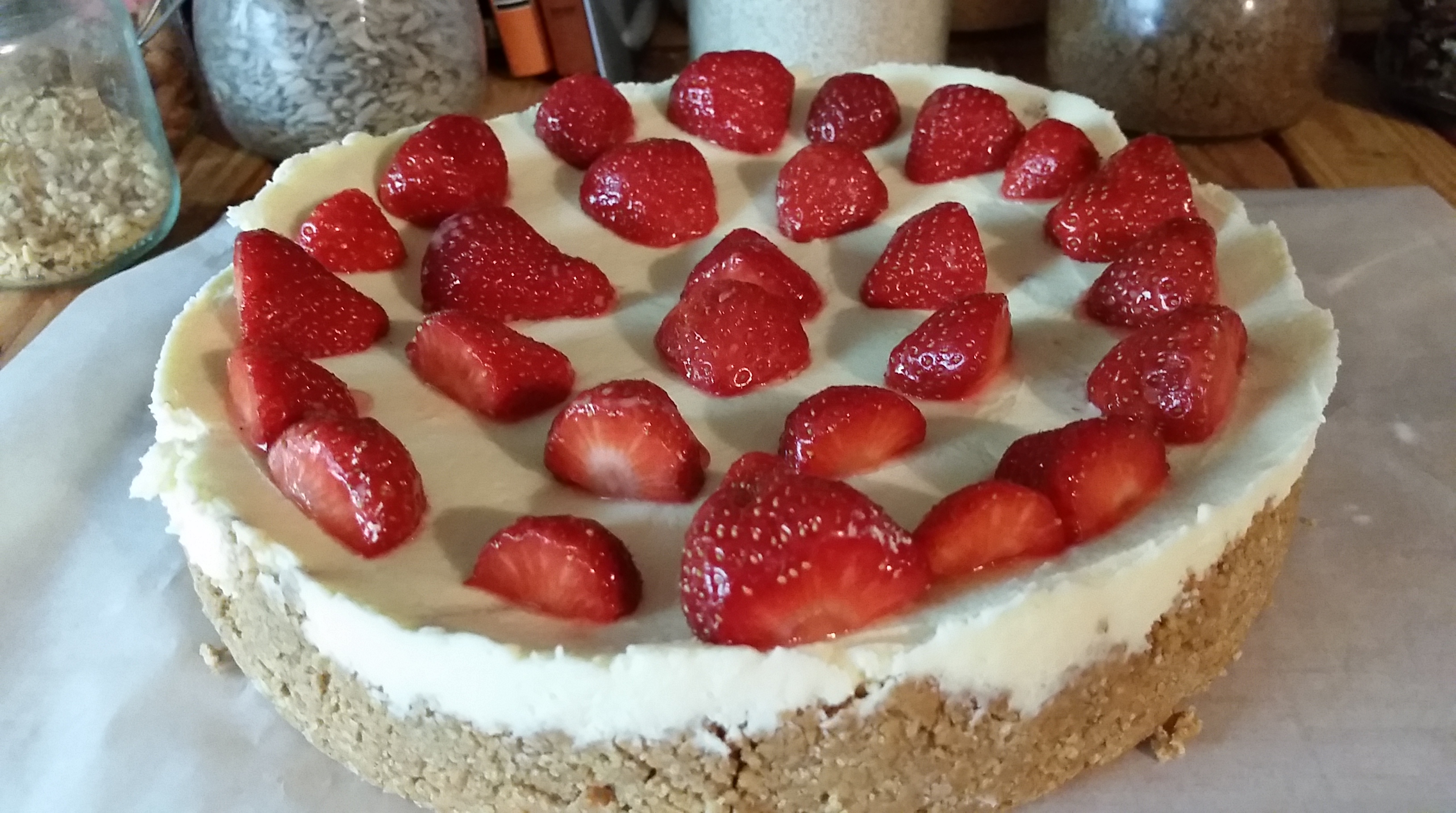 New York ostakaka er yfirleitt með sætum botni og osturinn með miklum vanillukeim, svo eru jarðaber á toppnum. Botninn er yfirleitt bakaður…en ekki hjá mér.