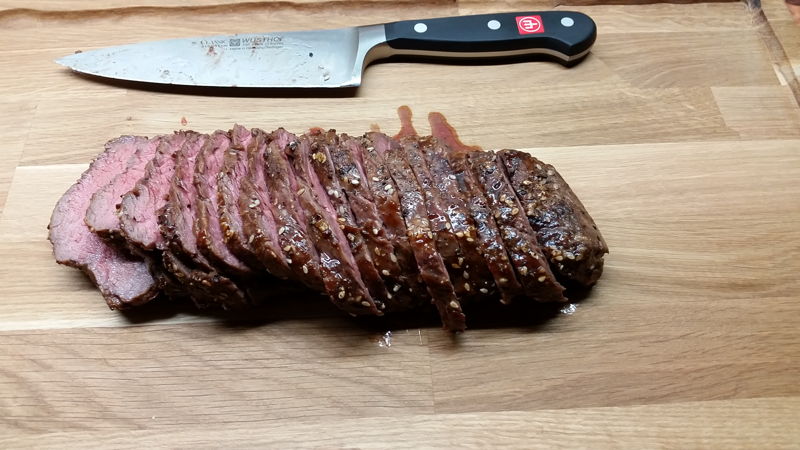 Ég notaði nauta framfillet og marineraði það í Sesam Ginger Teryiaki sósu frá Stonewall Kitchen, smá salt og pipar. Kjötið er steikt á pönnu í ólívuolíu og sett svo í ofn við 150°C þar til kjarnhitinn nær 60°C, tekið út og látið jafna sig í ca 15 mínútur, svo er það skorið í þunnar sneiðar, kannski saltað og piprað til ef þarf.