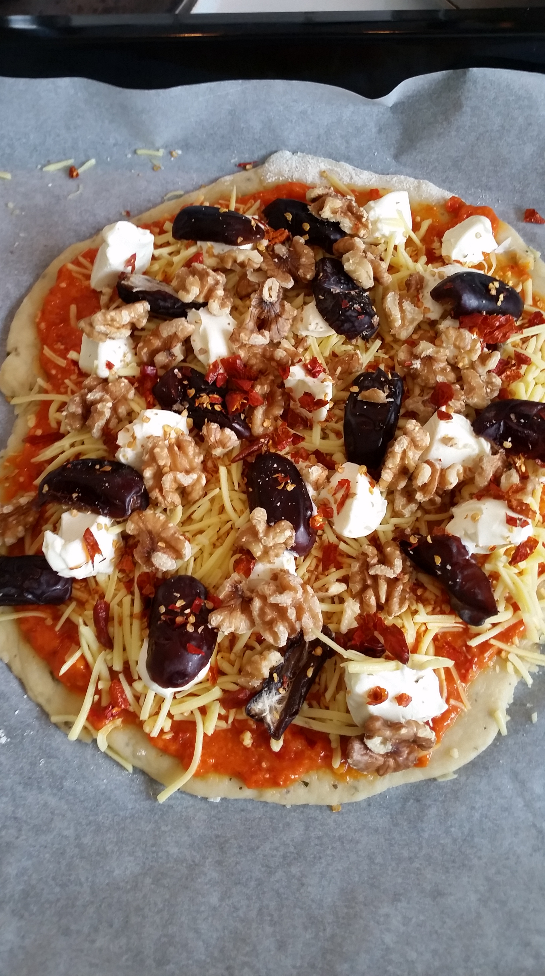 Pizza með döðlum, rjómaosti, chilli og valhnetum