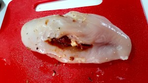Fylltar kjúklingabringur vafðar í beikon með sætum kartöflum og bláberjasalati