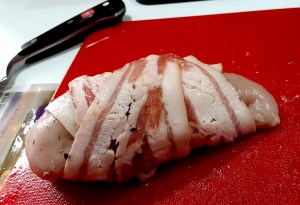 Fylltar kjúklingabringur vafðar í beikon með sætum kartöflum og bláberjasalati