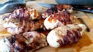 Fylltar kjúklingabringur vafðar í beikon með sætum kartöflum og bláberjasalati