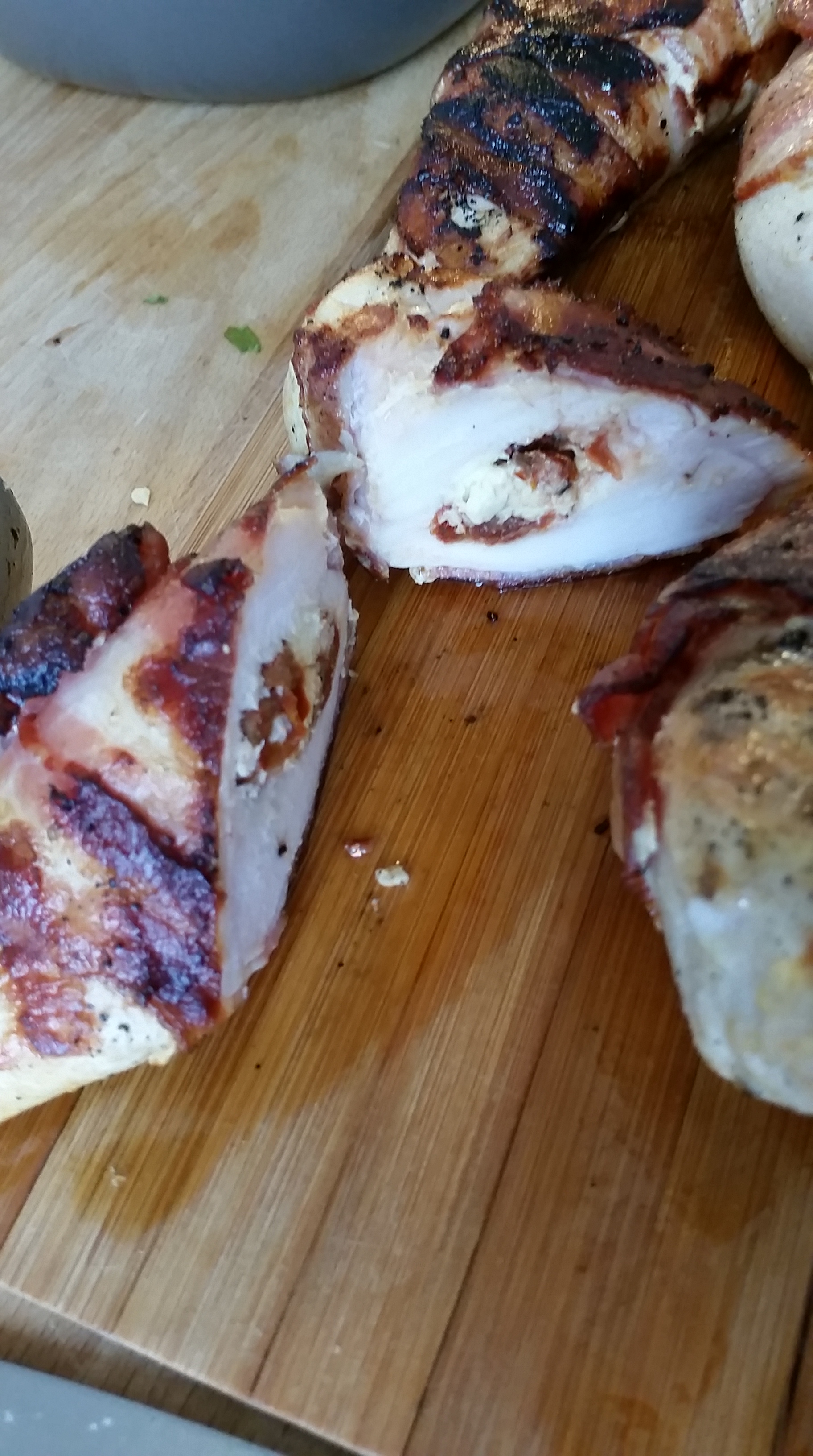 Fylltar kjúklingabringur vafðar í beikon með sætum kartöflum og bláberjasalati