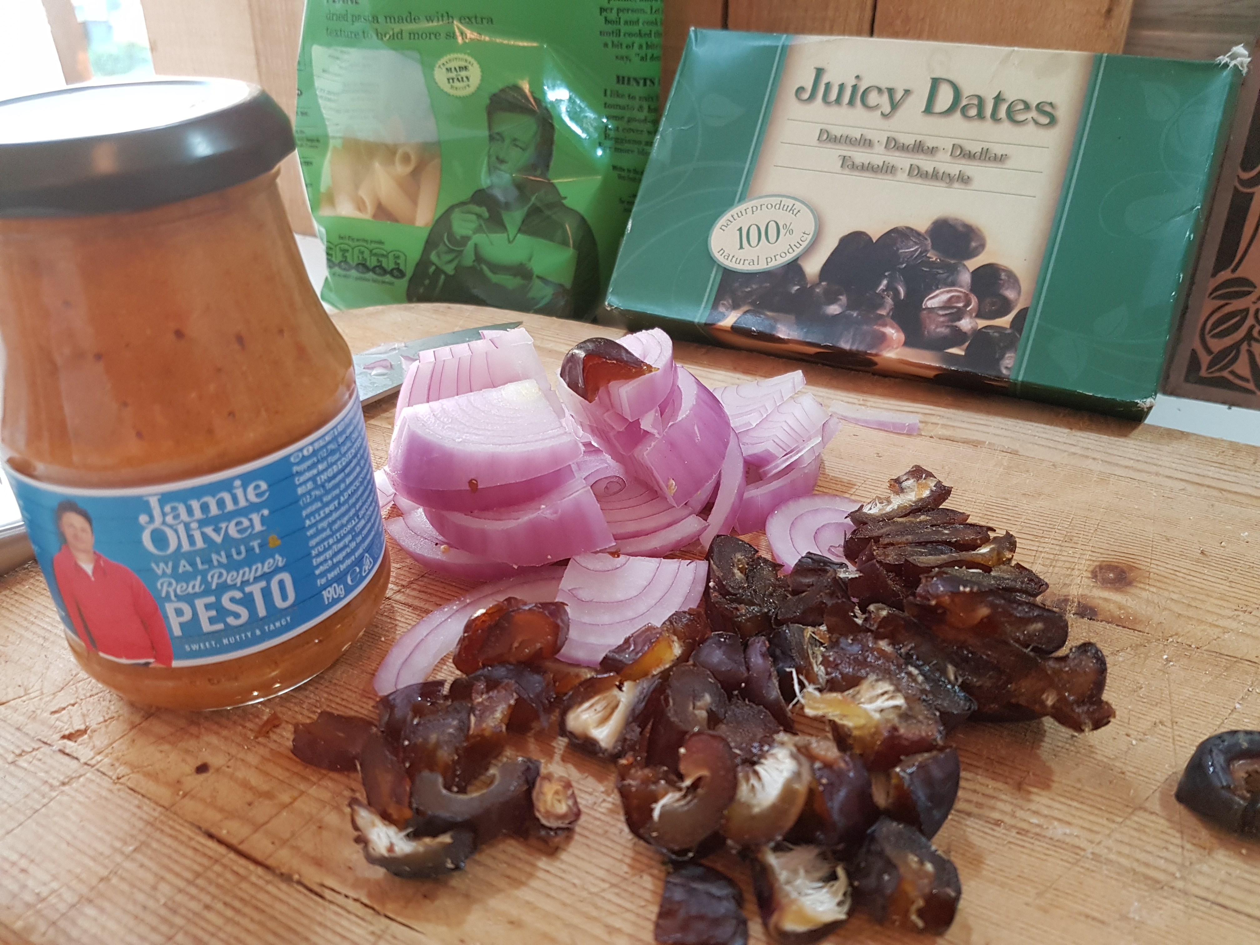 Penne pasta með beikoni, valhnetupestó og döðlum