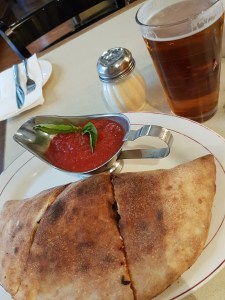 NY pizza með nautahakki, cheddar, sólþurrkuðum tómötum, ólívum, papriku og chilli mæjó.